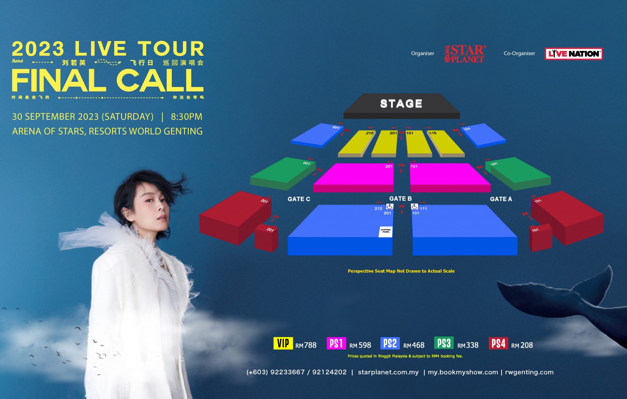 演唱会门票将以6月23日,下午2点,透过my.bookmyshow.com和 rwgenting.com 全面公开发售。票价从RM208起, 而首1千张门票将优惠10% 折扣 (只限VIP-PS3门票,需符合条规)。 预知更多演唱会详情,请浏览主办单位官方网 starplanet.com.my 或拨打热线 +603 92233667。