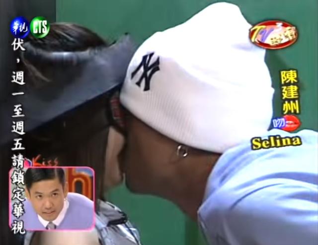 S.H.E于2001年出道,当时还是新人的她们上综艺节目宣传,《TV三贱客》由小猪、黑人、Makiyo主持,节目环节中嘉宾需蒙面,另一名嘉宾则趴在机器上向蒙面嘉宾缓缓靠近,由蒙面嘉宾按下按钮才可停下,当时Selina抽到黑人与她做互动,当时Selina是清纯玉女形象,面对这种游戏也表现得很紧张,开始后就问“可以按(停止)了吗”,但其他人告诉她还没有到很近,于是直接等到黑人直接嘴对嘴亲上已经来不及了,事后Selina不断尖叫,一度掩面无法面对,黑人则露出爽翻的表情,Selina过了一会才委屈表示“为什么我觉得有(伸)舌头的感觉。”陈建州则慌张回应“我真的没有伸舌头,你不要这样讲”,Makiyo也表示Selina哭了。