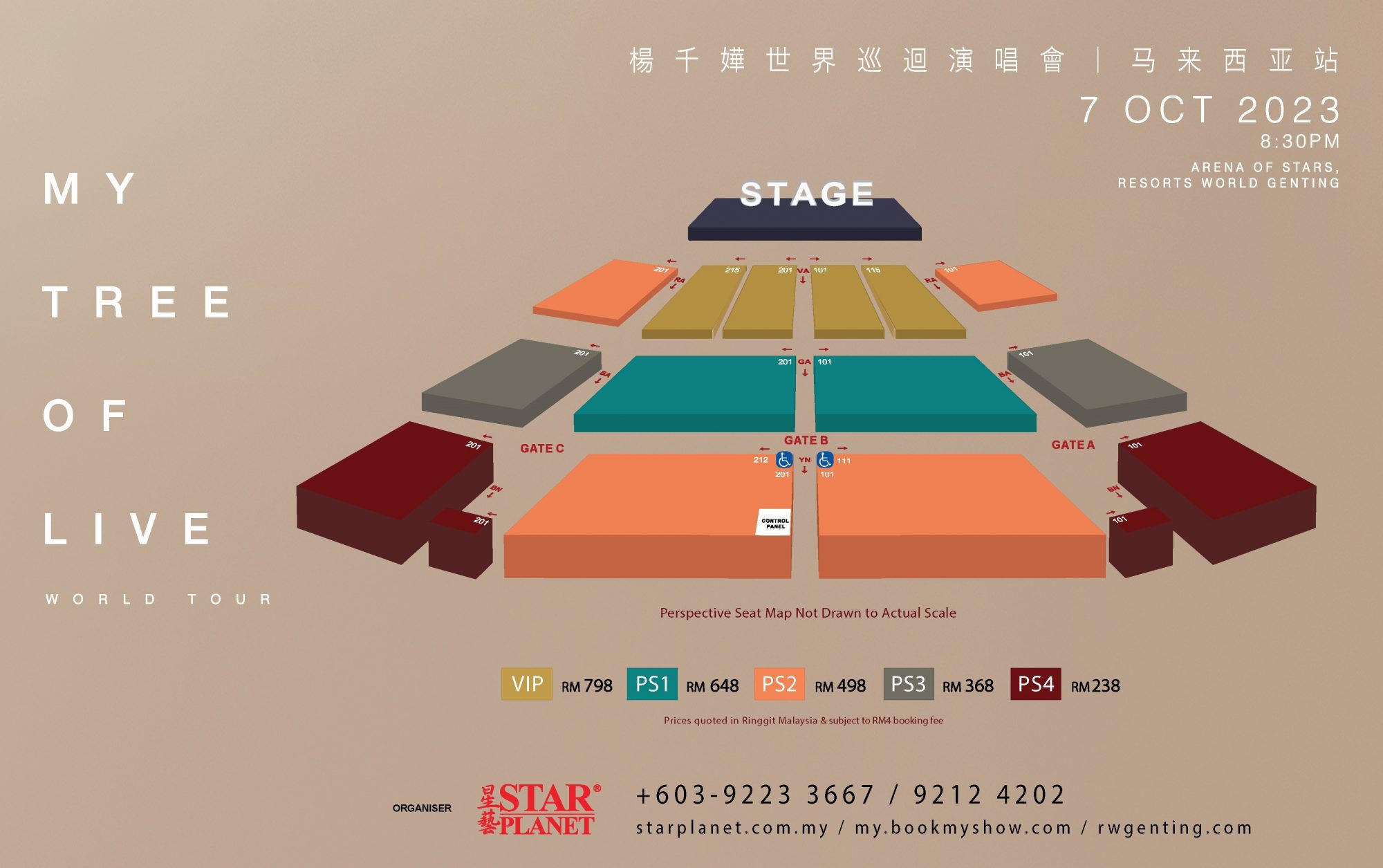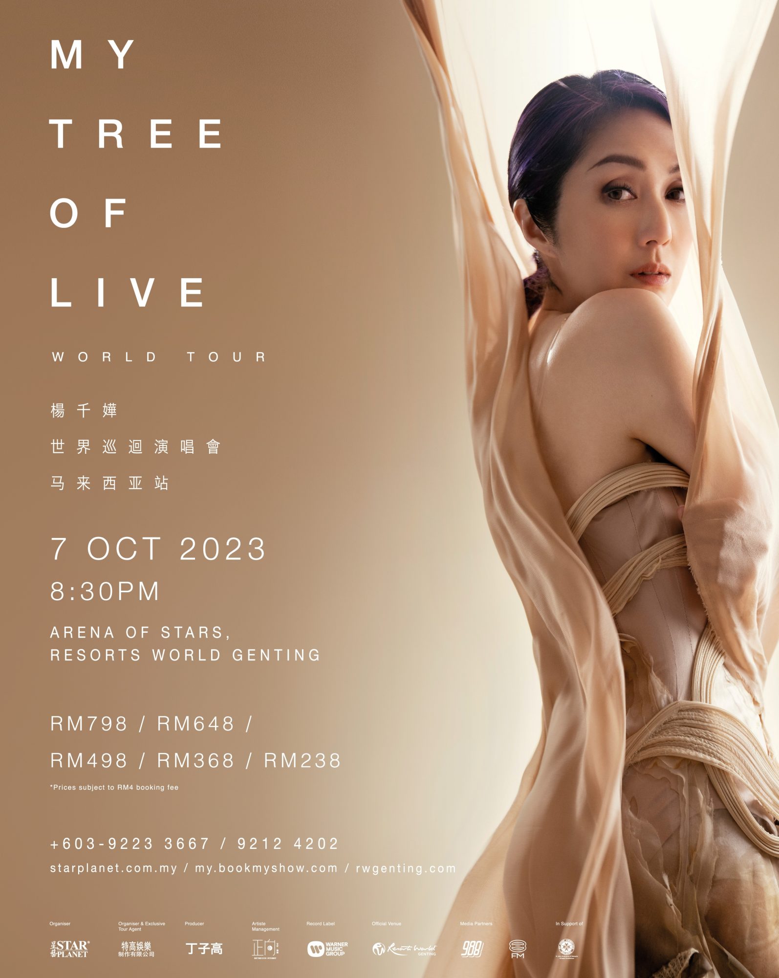 由Star Planet星艺娱乐主办的《杨千嬅My Tree Of Live世界巡回唱会─ 大马站》 的门票分别为RM238、RM368、RM498、RM648和RM798。门票将于7月20日,下午2点, 正式公开发售。