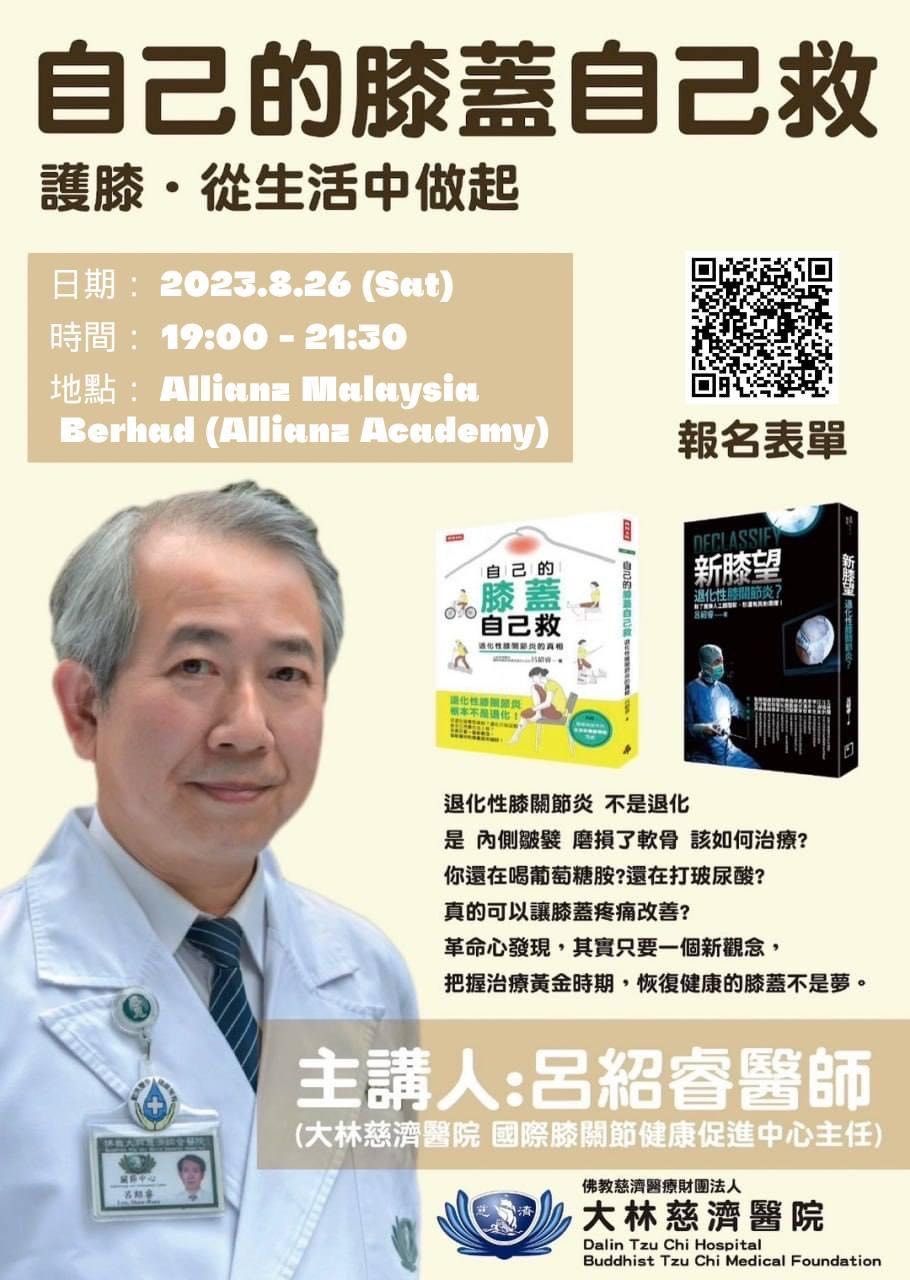 有膝关节疼痛困扰的朋友可要留意了,被称作“台湾最难挂号”的膝关节名医吕绍睿医生,将于8月25日及26日来马举办《自己的膝盖自己救 护膝.从生活动做起》演讲暨签书会,并且免费开放公众报名,让有需要的朋友了解更多关于他对“退化性关节炎”的治疗观点,以及预防膝关节炎的知识等。