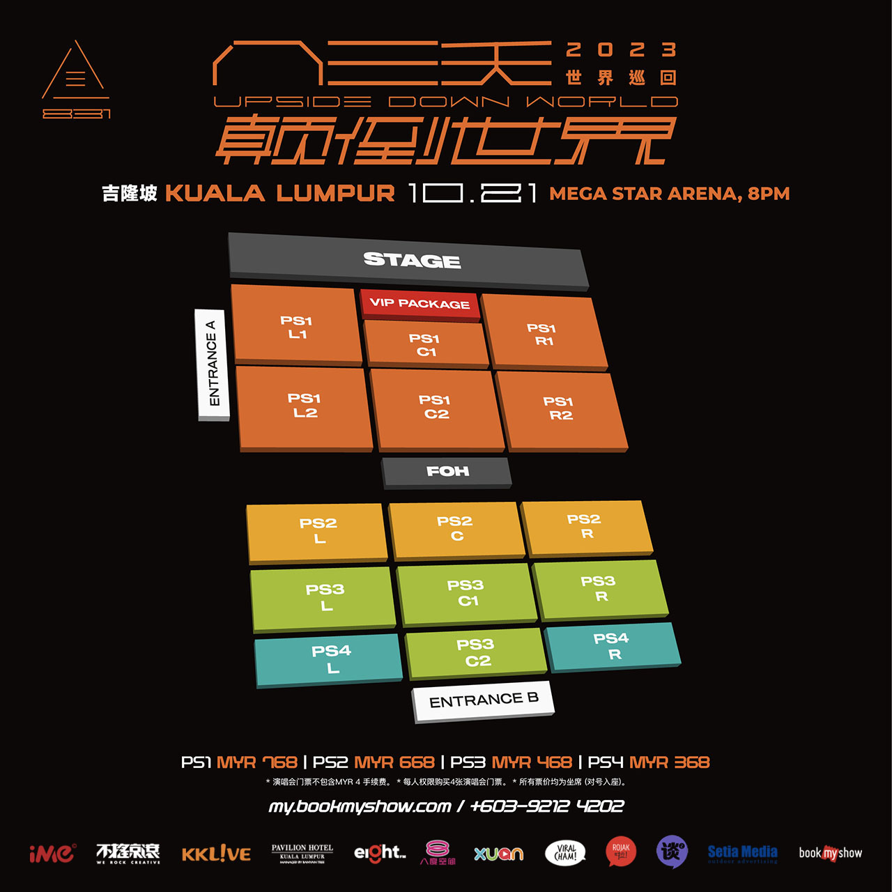 《八三夭 2023 世界巡回「顛倒世界」吉隆坡站》的票价一共分成4种,分别是RM768(PS1)、RM668(PS2)、RM468(PS3)和RM368(PS4),票价未含RM4手续费。门票将在8月28日(星期一),下午12点,在指定售票网站my.bookmyshow.com正式开卖。每人仅限购买4张演唱会门票。