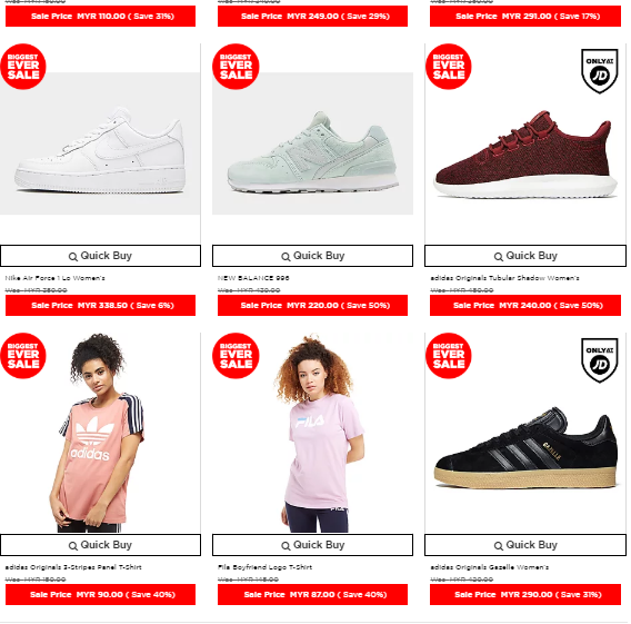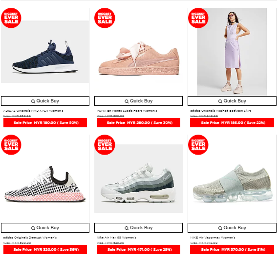 好康来咯!准备好你们的钱包疯狂购物了吗?英国潮牌店JD Sports特别为大家带来了Biggest Ever Sale促销活动,各大名牌如Nike、Adidas、New Balance鞋子、服饰及帽子等都有折扣,而且有的还高达50%!现在不买还等何时?
