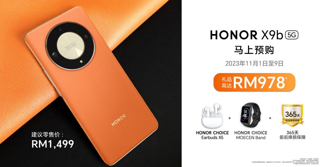 民众在11月1日至9日预购期间下单,可获得价值高达978令吉的好礼,包括365天前后摔损保障、HONOR Choice Moecen Band智能手环及HONOR Choice Earbuds X5蓝牙耳机。