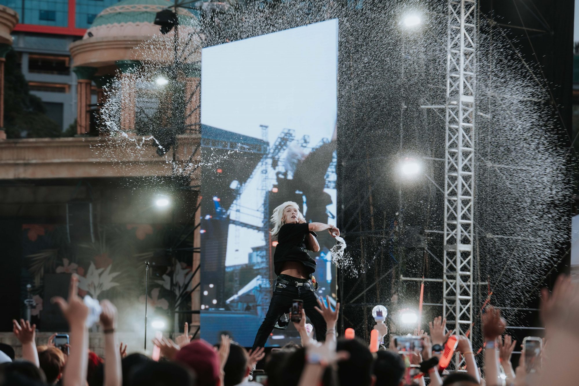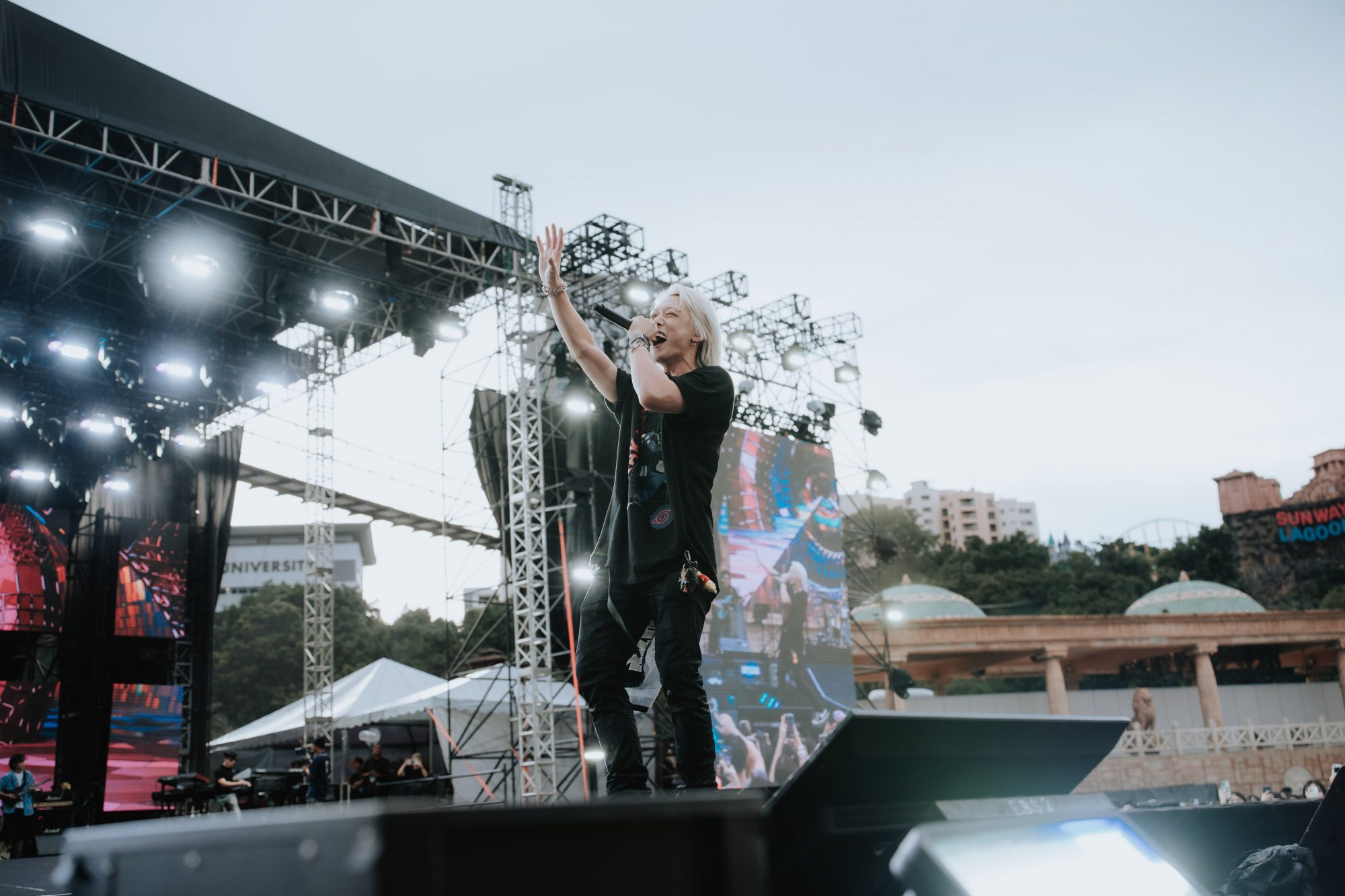 随即登场的 SHAUN 在3人乐队的配合下带来了拿手的 EDM歌曲,演唱《Shooting Star》与舞台喷起火花将唯美氛围拉满。体格健硕的他更脱下外衣,漏出养眼的二头肌,以“apa khabar, nama saya Shaun!” 向大家问好,但频频忘词而连忙看回提字机上的马来语,令粉丝感到感动又好笑。