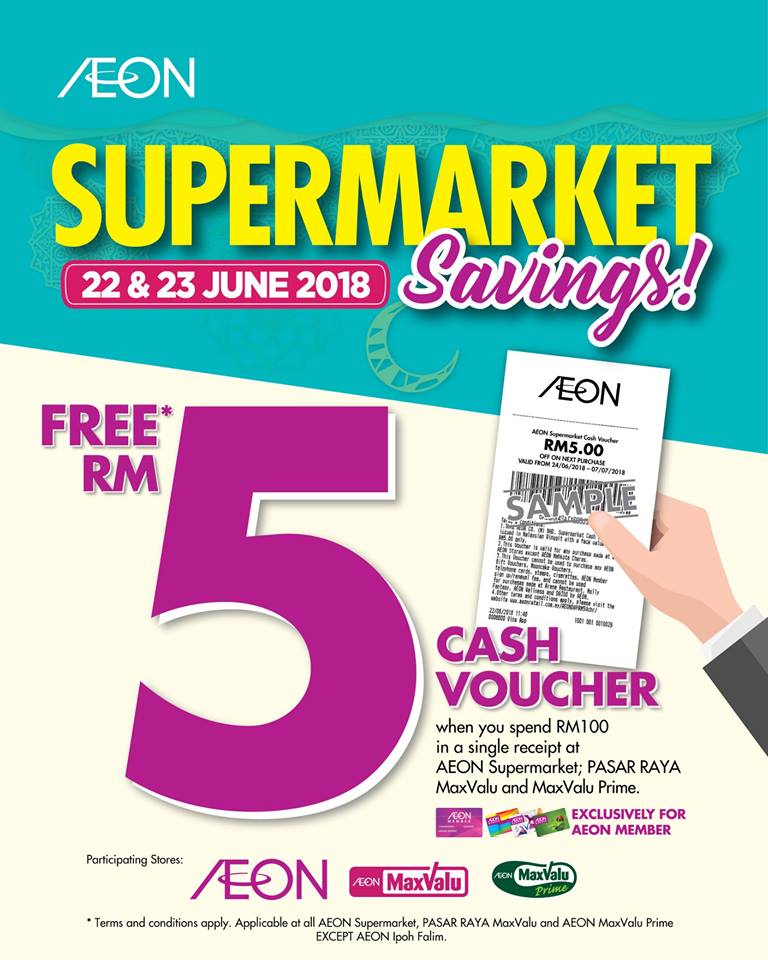 AEON免费送出现金礼劵 22 Jun , 2018 | 吃喝玩乐 爱逛AEON的朋友注意咯!AEON将于6月22日及23日,免费送出现金礼劵! 在这段期间,凡于AEON Supermarket、Pasar Raya MaxValu或Max Valu Prime消费满RM100,即可获得AEON送出的RM5现金礼劵。 这项优惠只限AEON会员,所以在消费时记得携带会员卡,并出示给柜台服务人员以获取现金礼劵。 分享