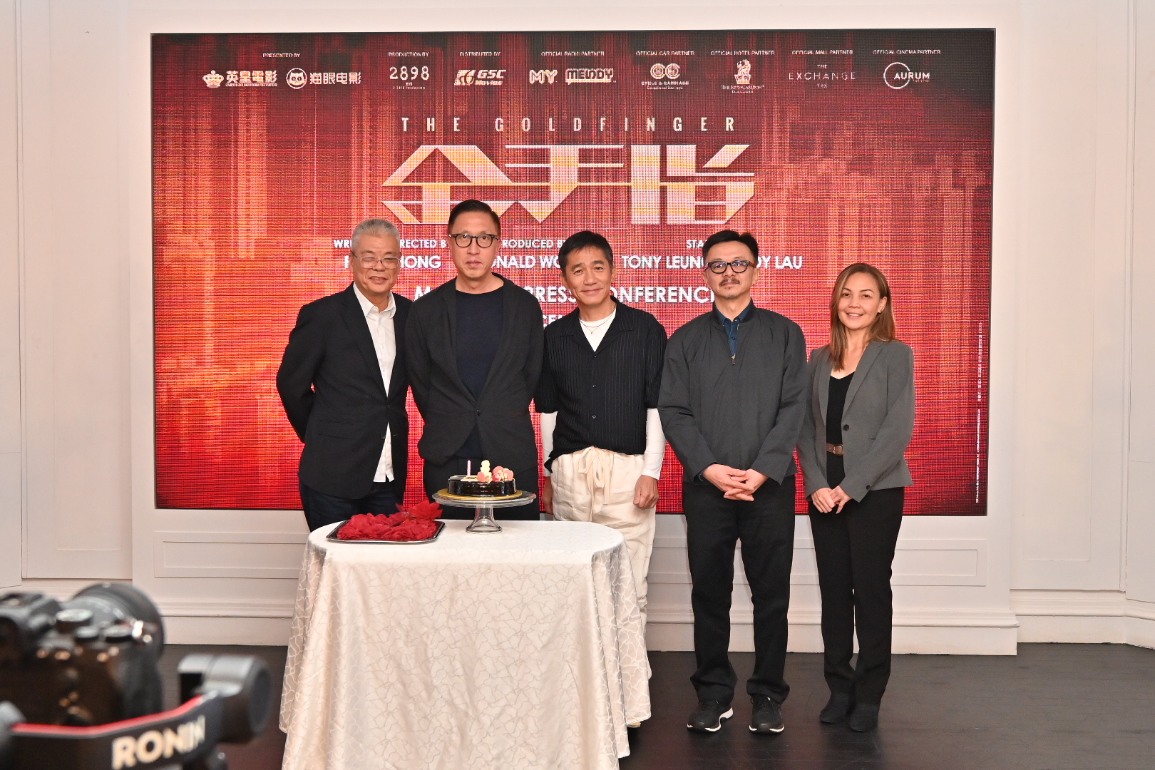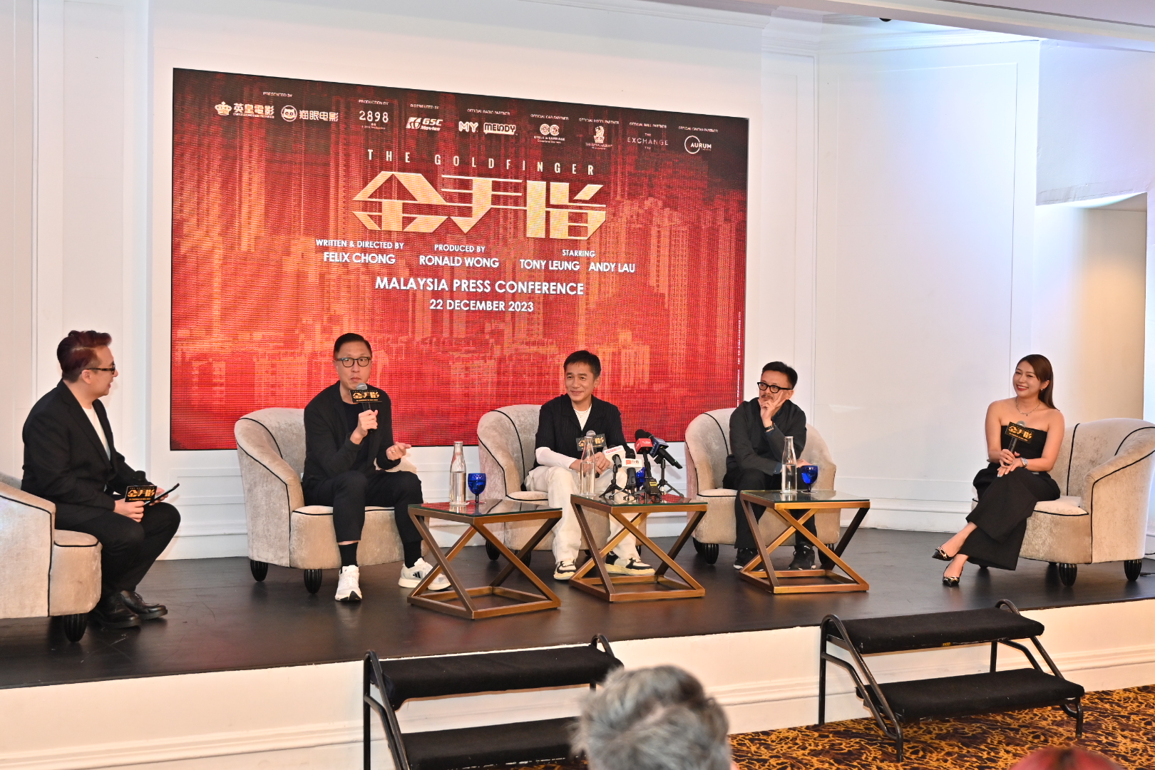 庄文强(左2起)、梁朝伟和黄斌来马宣传《金手指》。