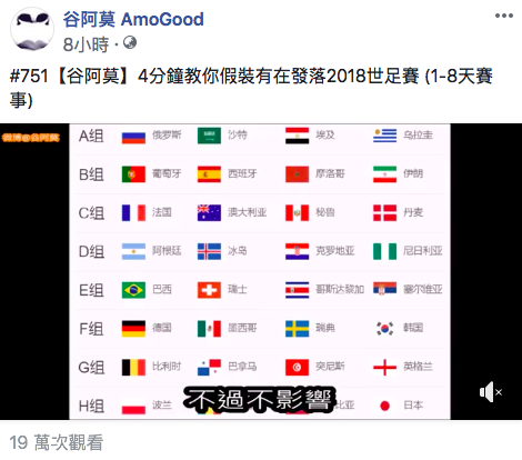 2018年世界杯足球6月开打,成为近日最夯话题。号称“二创”的网红谷阿莫这次不做“X分钟看完XX电影”,而是“4分钟教你假装有在发落2018世足赛(1-8天赛事)”,影片中直接使用了世界杯的转播画面,挑战“FIFA”的查水表能力,连获得世界杯转播权的爱尔达小编都忍不住说:“祝您一切安好。”