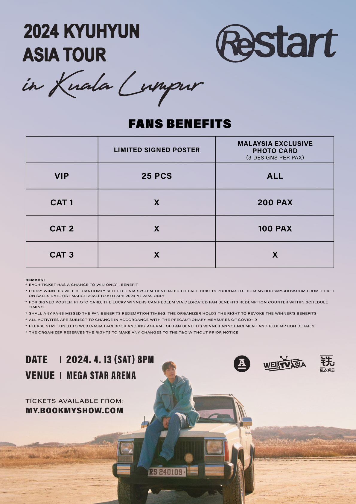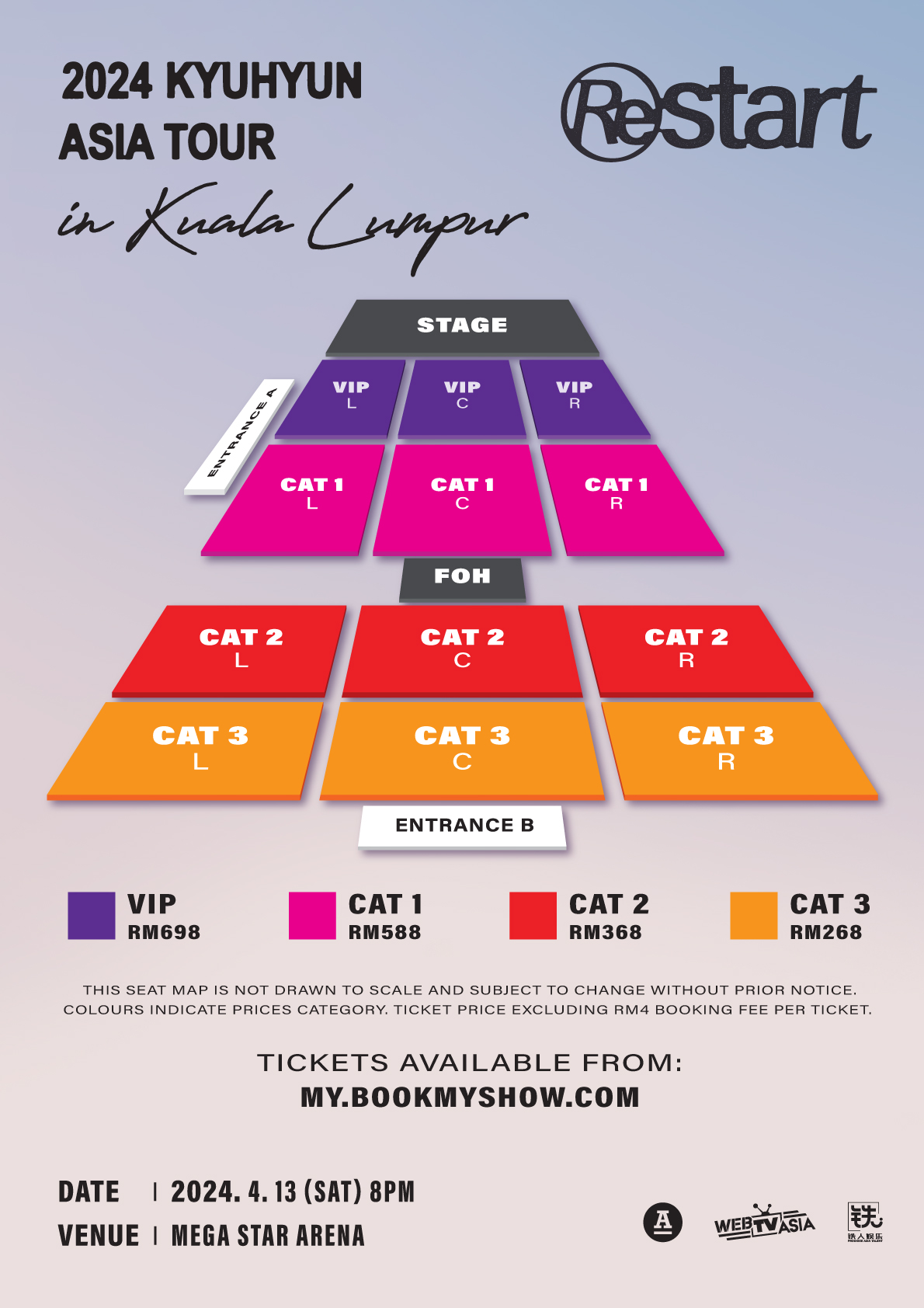 圭贤将于4月13日晚上8时,于Mega Star Arena举办2024 KyuHyun Asia Tour《RESTART》in Kuala Lumpur,票价分为VIP(RM698)、 CAT 1(RM588)、CAT 2 (RM368)以及CAT 3(RM268),票价未包含RM4手续费,马来西亚站将于3月1日早上11时正于 my.bookmyshow.com正式开票。