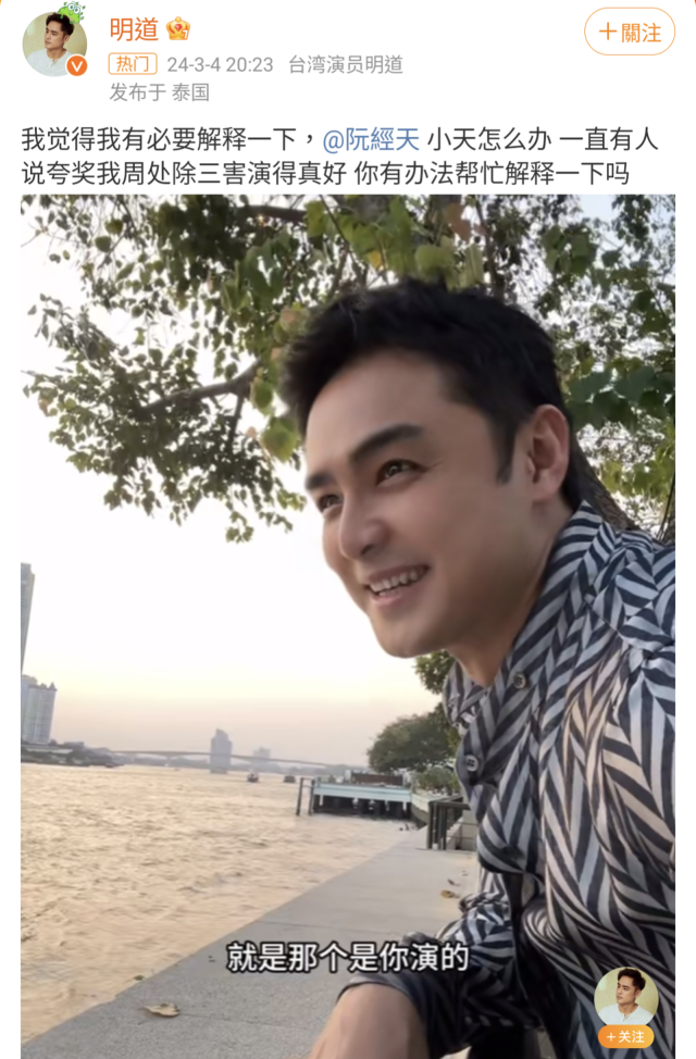 明道在社交媒体幽默标注阮经天:“我觉得我有必要解释一下,小天怎么办,一直有人夸奖我《周处除三害》演得真好,你有办法帮忙解释一下吗?”