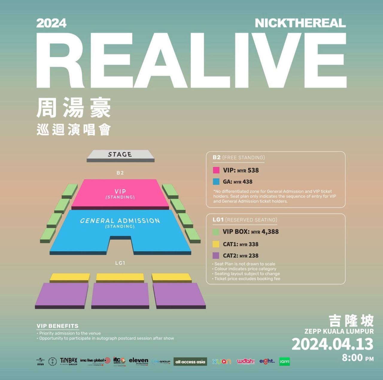 票价:RM868(VIP)、RM668(CAT 1)、RM468(CAT 2)、RM268(CAT 3)