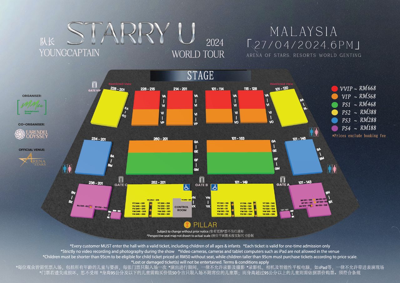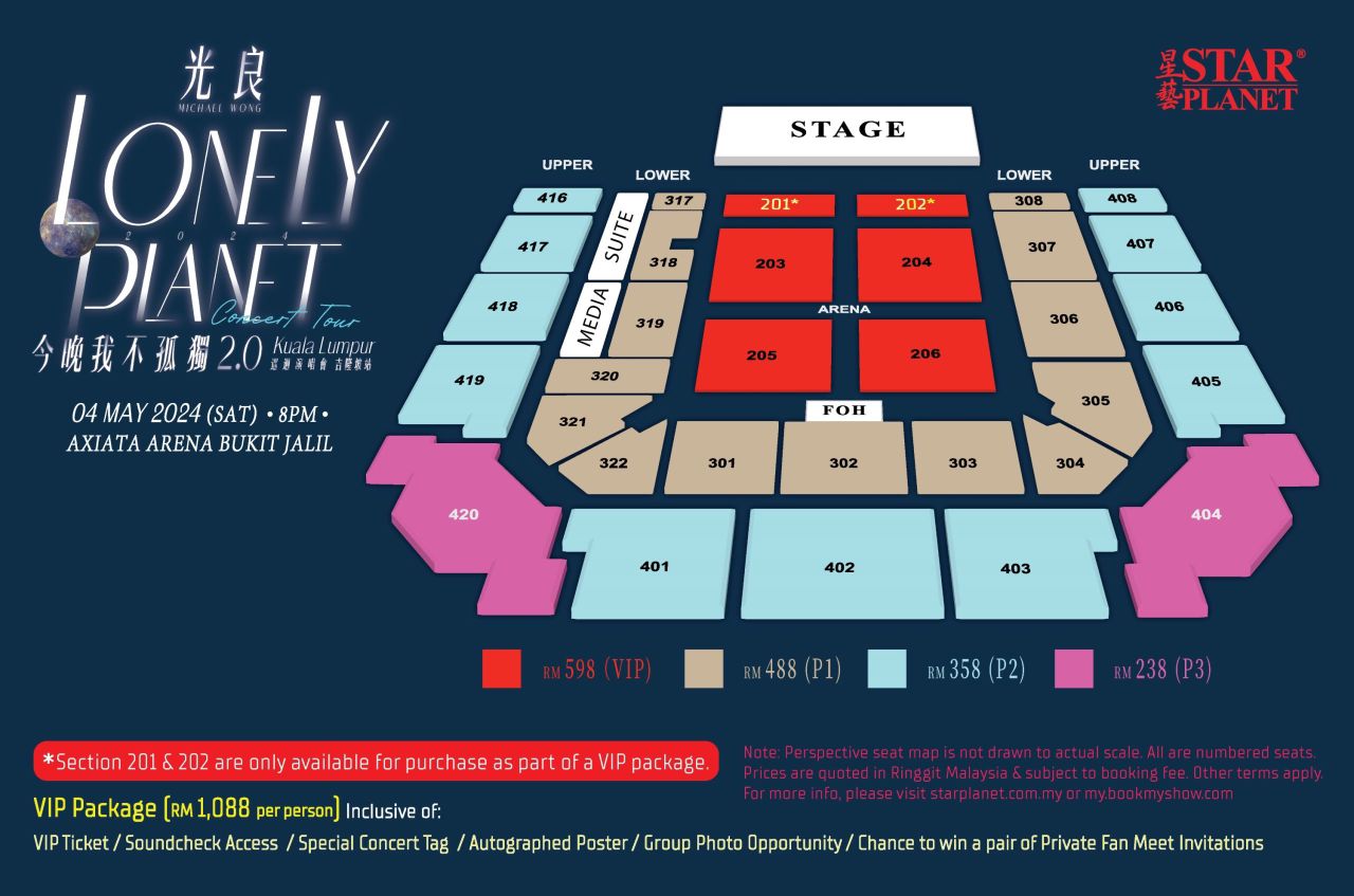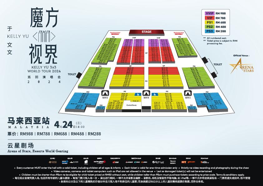 票价:RM668(VVIP)、RM568(VIP)、RM468(PS1)、RM388(PS2)、RM288(PS3)、RM188(PS4)