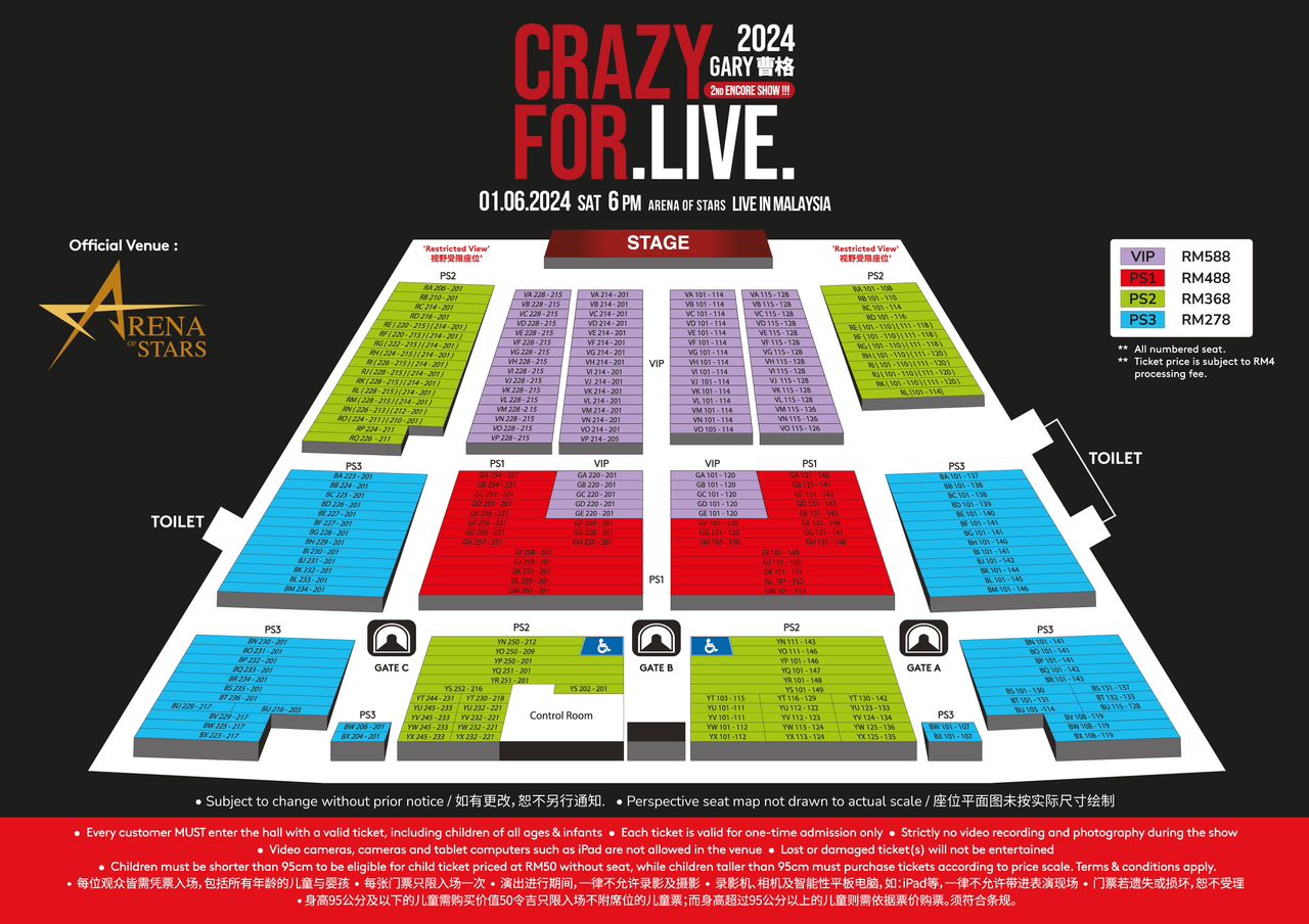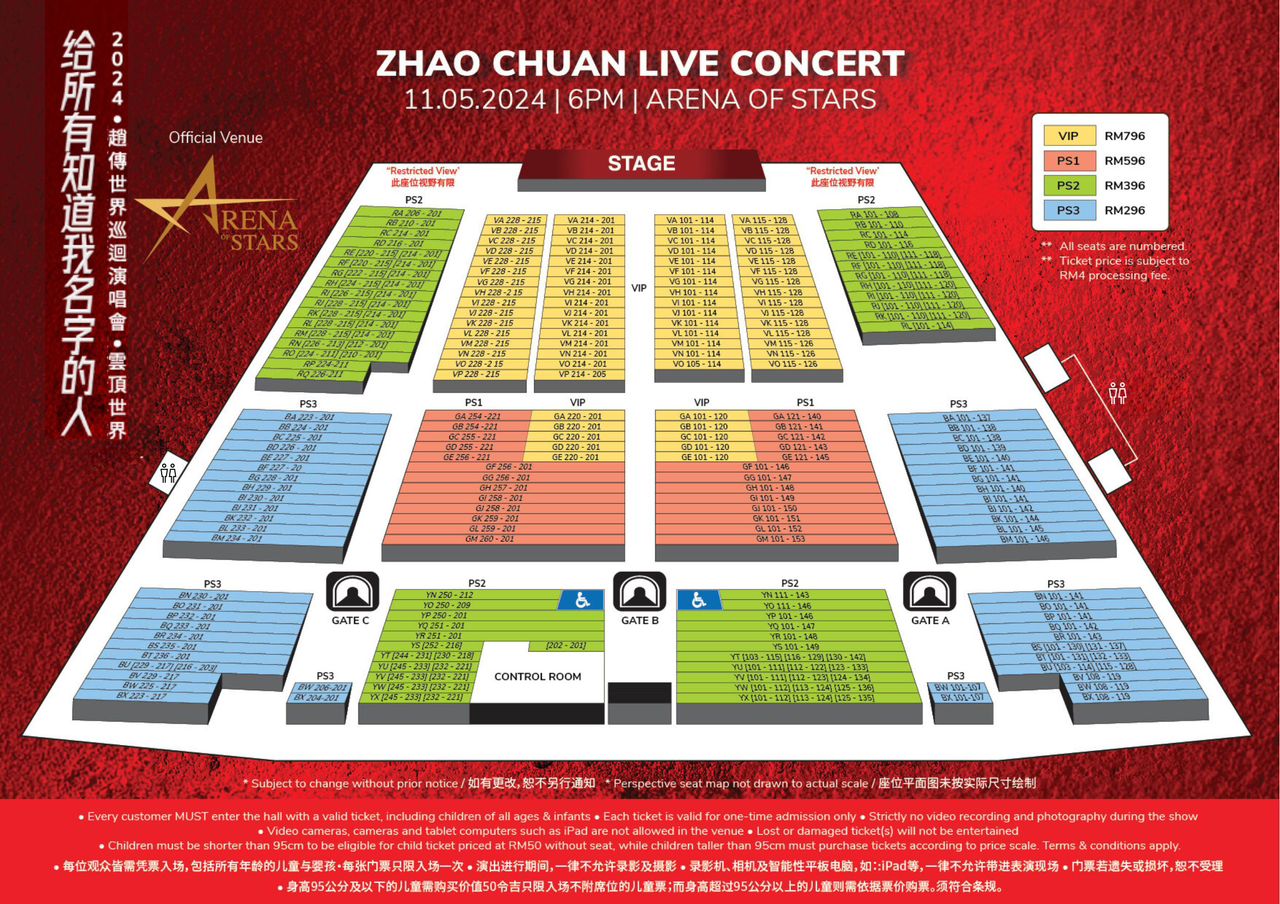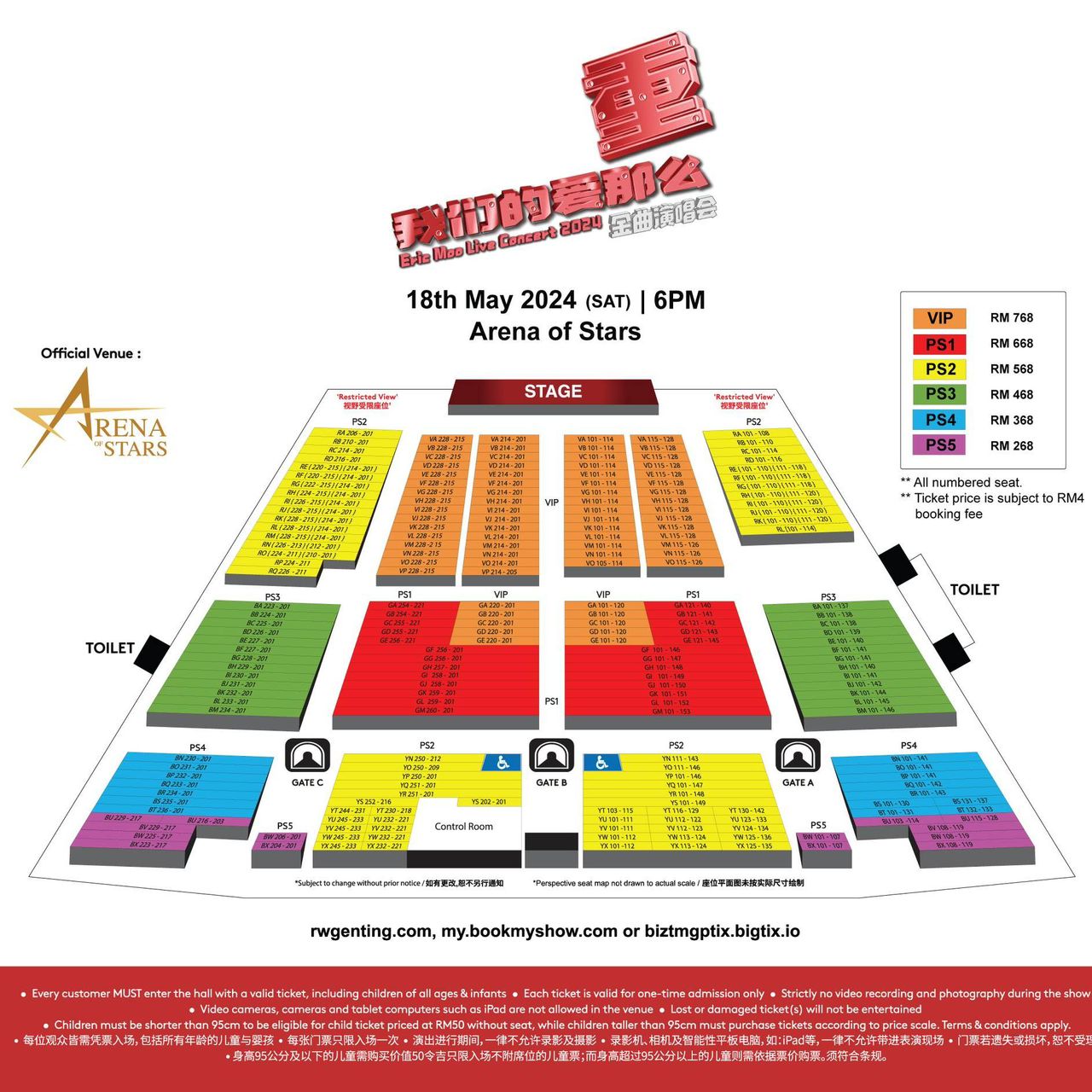 票价:RM668(VVIP)、RM568(VIP)、RM468(PS1)、RM388(PS2)、RM288(PS3)、RM188(PS4)