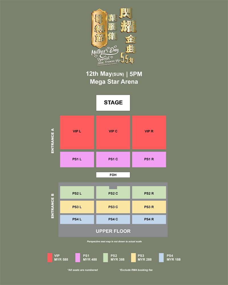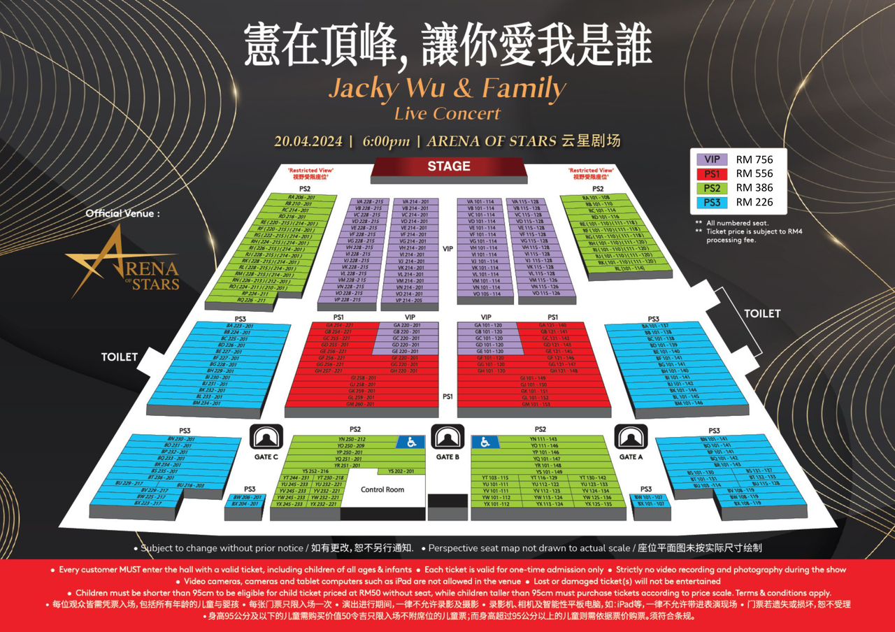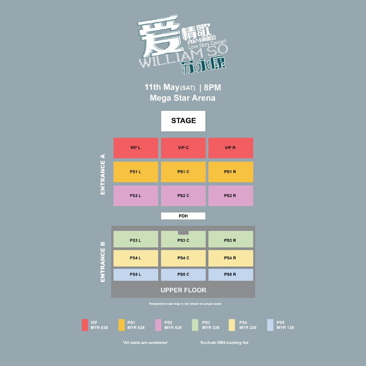 票价:RM638(VIP)、RM538(PS1)、RM438(PS2)、RM338(PS3)、RM238(PS4)、RM138(PS5)