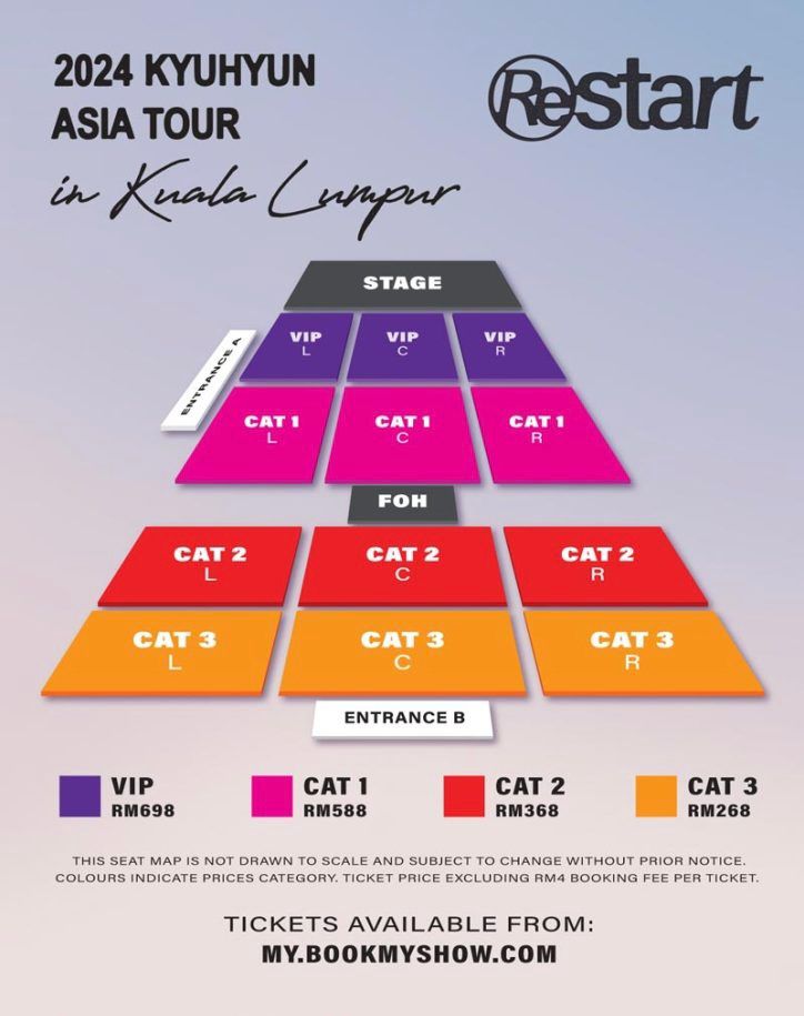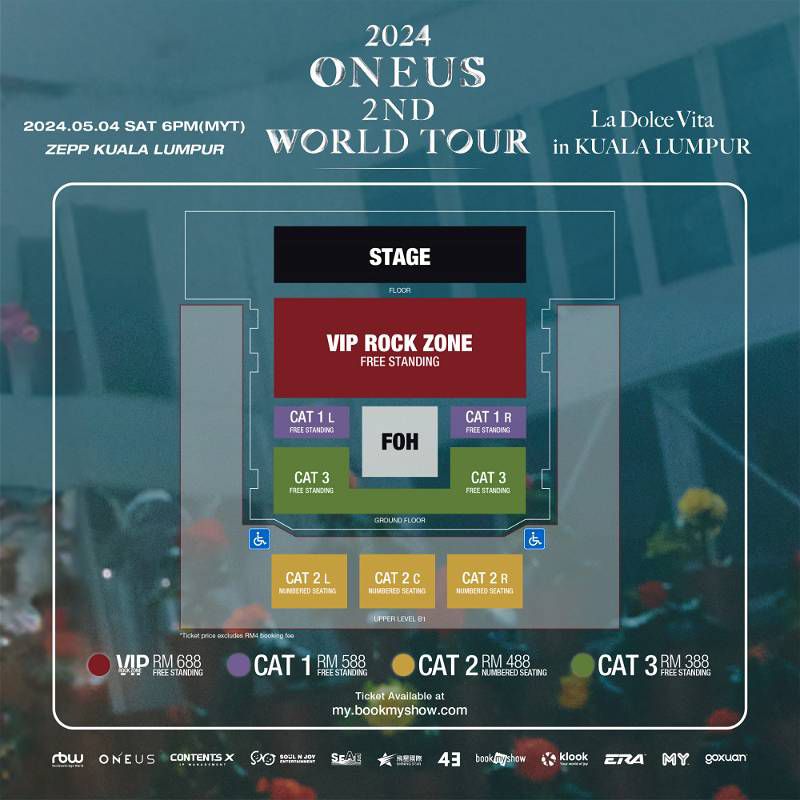 票价:RM888(CAT 1)、RM738(CAT 2)、RM638(CAT 3)、RM488(CAT 4)、RM388(CAT 5)、288(CAT 6)