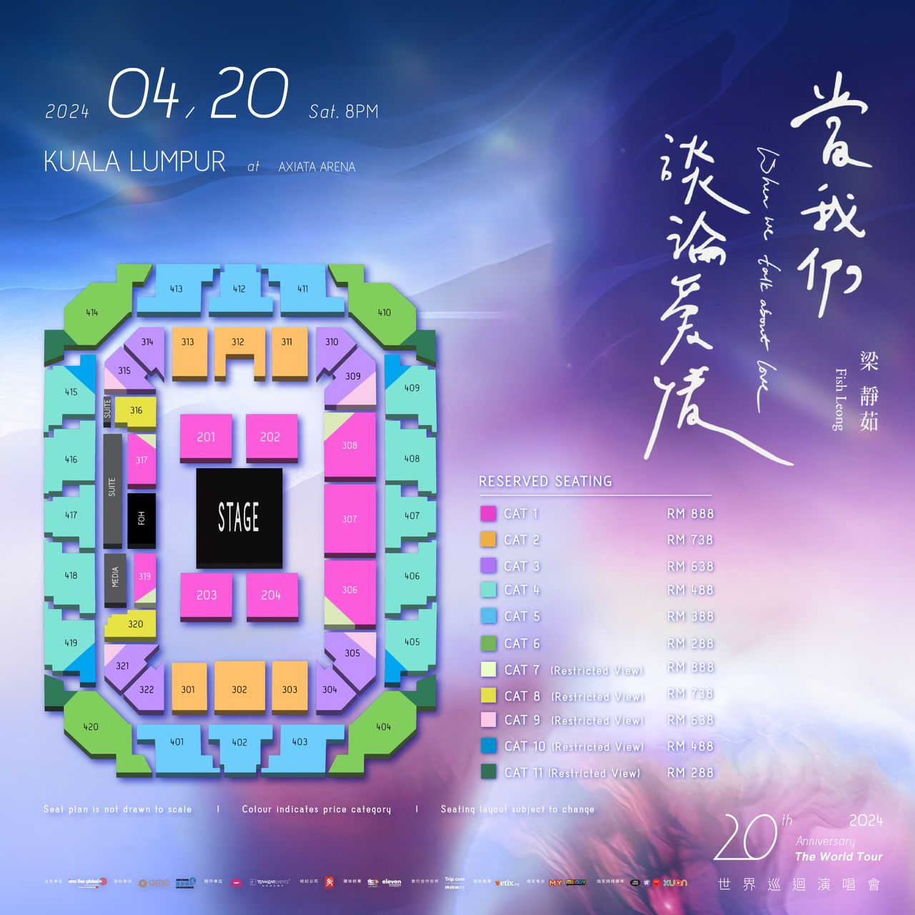 票价:RM858(VIP)、RM628(CAT 1)、RM528(CAT 2)、RM428(CAT 3)、RM358(CAT 4)、RM288(CAT 5)