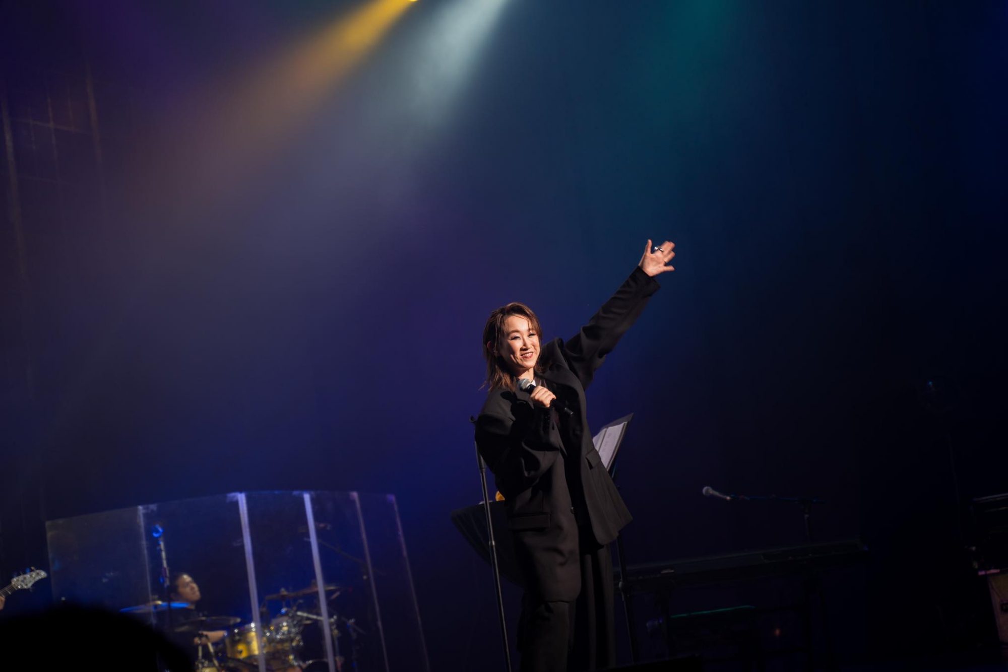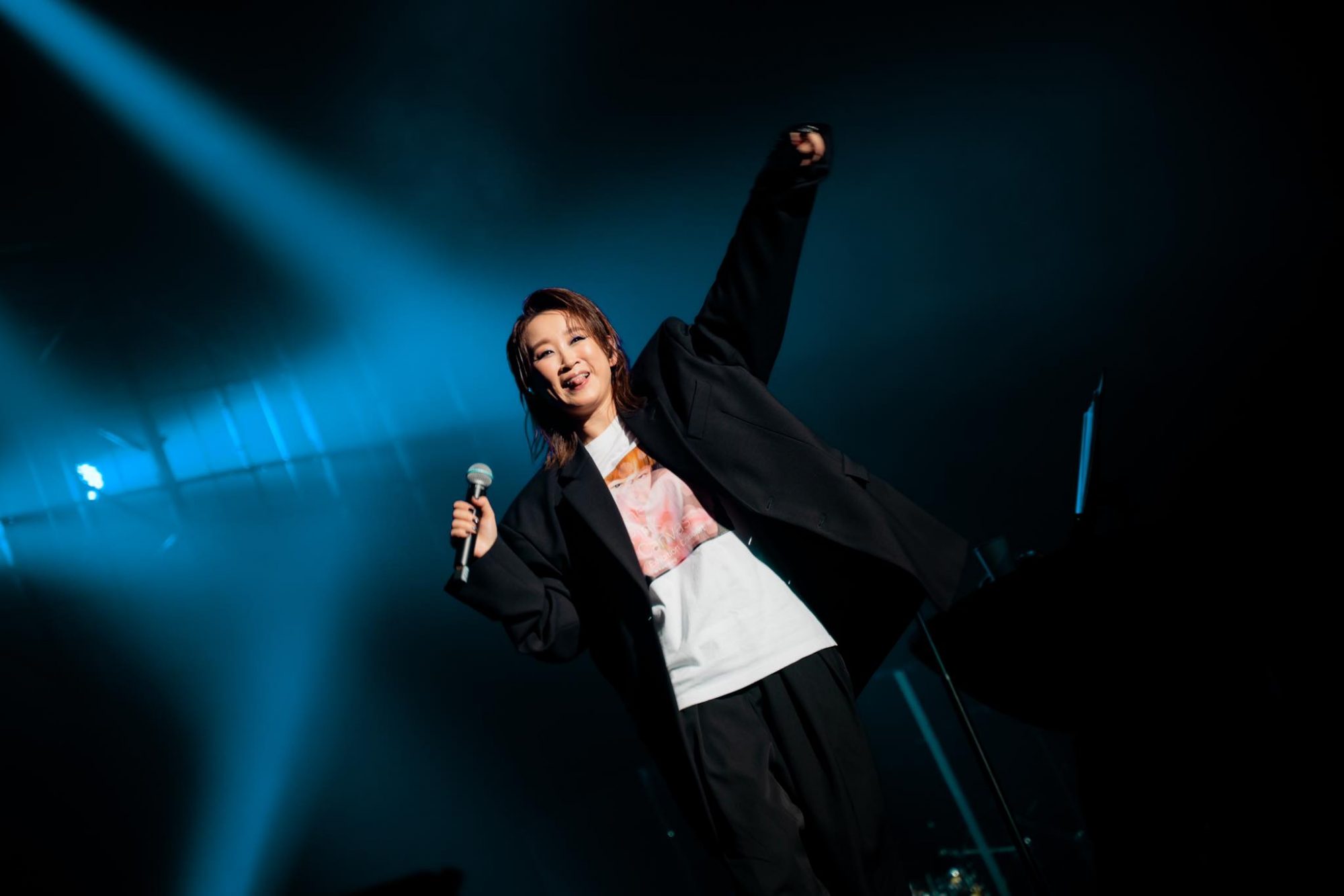 在演唱好几首快歌后,她跟大家打招呼,还问大家说:“你们是不是很可以热烈一点(欢呼)?是不是怕羞?大家会不会以为听我的音乐会会很文静?”