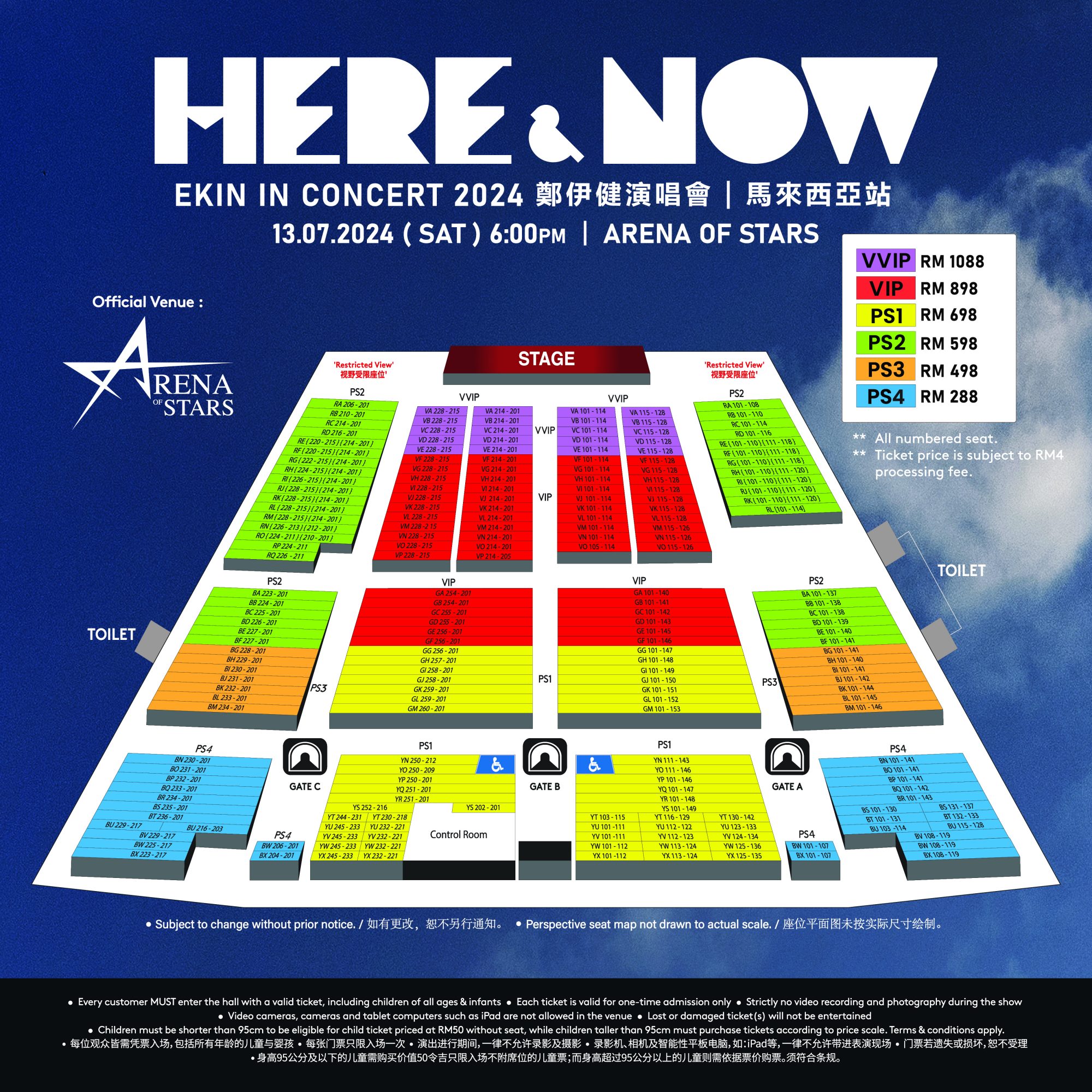 郑伊健《HERE & NOW 郑伊健演唱会 2024 – 马来西亚站》将在 2024 年 7 月 13 日,旁晚 6 点在 ArenaOf Stars 举行。 票价为 VVIP – RM1088, VIP – RM898, PS1 – RM698, PS2 – RM598, PS3 – RM498, PS4- RM288 并可在5月14 日下午12时于ETIX.MY 与 RWGENTING.COM 网站购买。