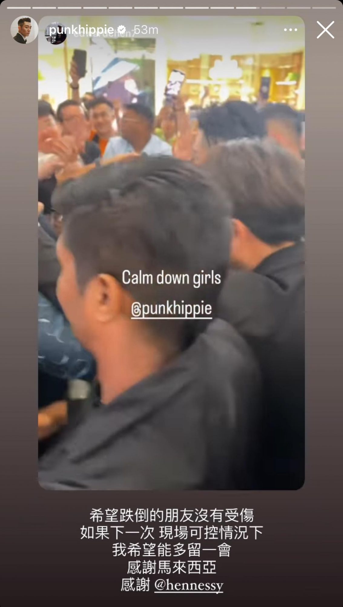 【见面会】Pakho周柏豪在中国的工作结束后,今晚(8日)来到大马TRX出席品牌活动。他的人气高涨,让活动现场引起混乱,有粉丝还在追赶周柏豪时,在推撞中跌倒,他在IG限动慰问说:“希望跌倒的朋友没有受伤,如果下一次现场可控情况下,我希望能多留一会,感谢马来西亚。”