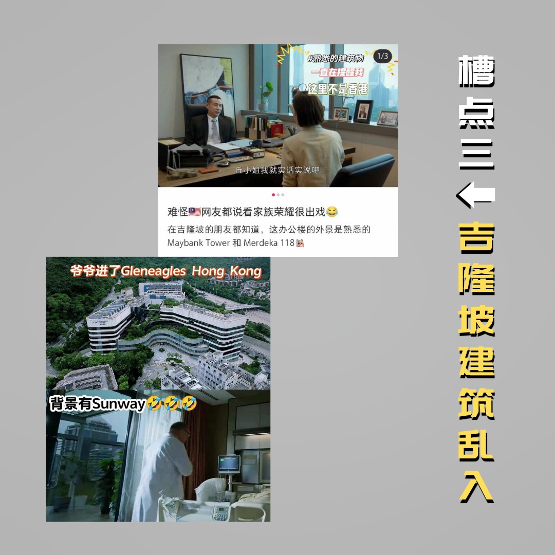 对于马来西亚观众,尤其是住在雪隆区的观众来说,剧中的场景实在是太熟悉了。有网友指出,“熟悉的建筑物一直在提醒我,这不是香港。”有热心网友截取了剧中的场景,指出剧情中提到爷爷生病住进了香港的医院,但背景却是马来西亚的Sunway建筑。