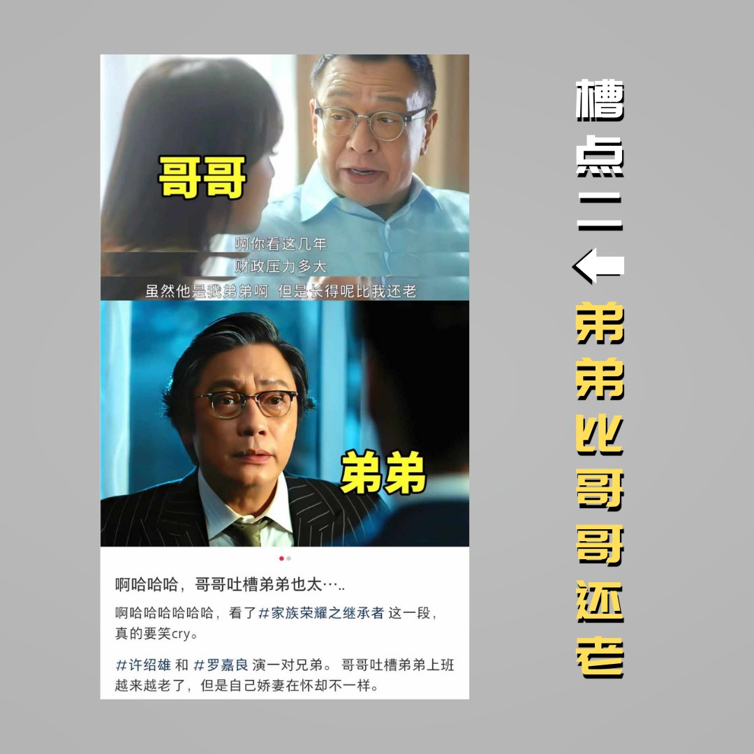 剧中,许绍雄饰演邱家的长子,罗嘉良则饰演二儿子,但从外表上看罗嘉良却显得比许绍雄老成许多。对此,编剧巧妙地安排了一段戏,让许绍雄吐槽弟弟罗嘉良因财政压力大而显得比自己老,这才稍微圆了这个情节。此外,饰演许绍雄父亲的刘江与许绍雄实际上只差了两岁。