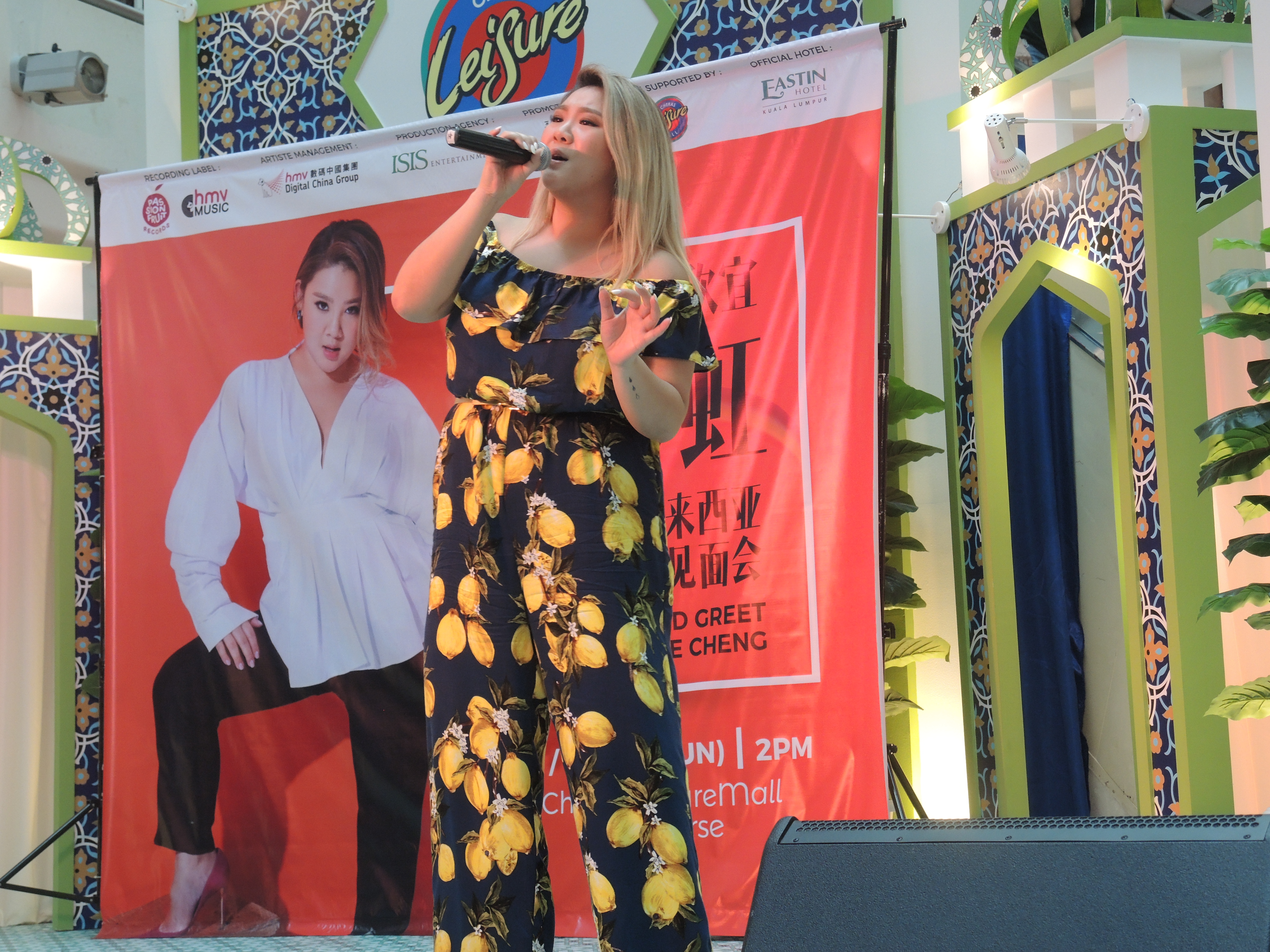 郑欣宜续昨天录制本地歌唱节目后,今天到Leisure mall为新单曲《黑彩虹》做宣传会歌迷,并且演绎了三首歌曲《黑彩虹》、《爱回家》和传唱度高的《女神》,直让大家听出耳油!她更亲民跟大家打招呼说“Apa Khabar”(你好吗)。来马几天的她还没吃榴莲和肉骨茶,待明天工作结束后立马要品尝。