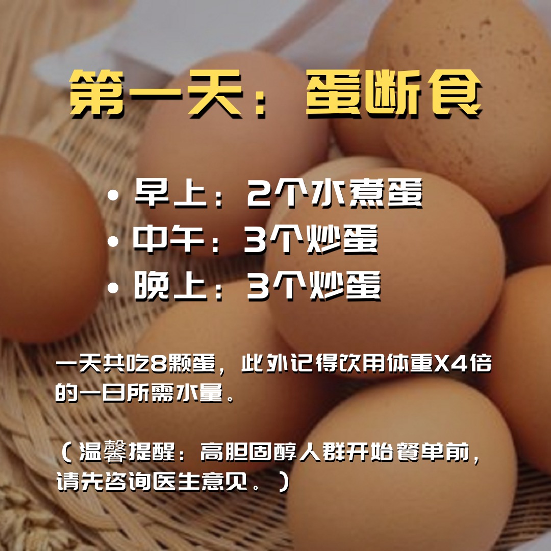 一天共吃8颗蛋,此外记得饮用体重X4倍的一日所需水量。(温馨提醒:高胆固醇人群开始餐单前,请先咨询医生意见。)