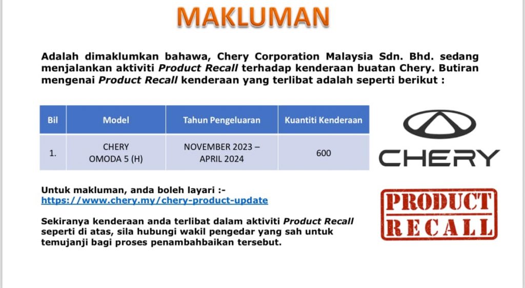 针对早前引起广泛关注的Chery Omoda 5车轴断裂事件,大马奇瑞有限公司已于5月3日启动召回措施,目前已检查600辆中的592辆,预计将在6月底完成所有车辆的检查。