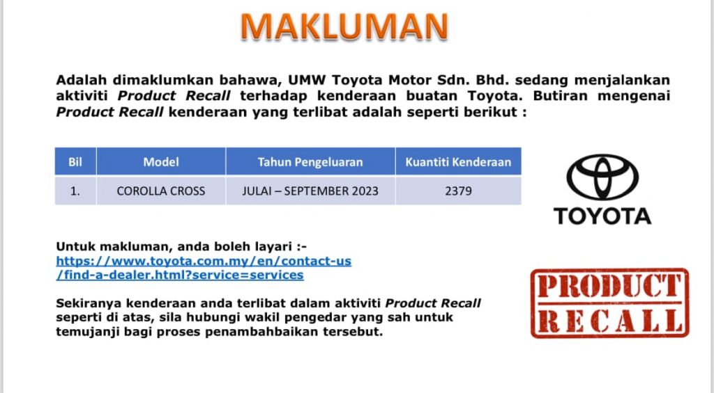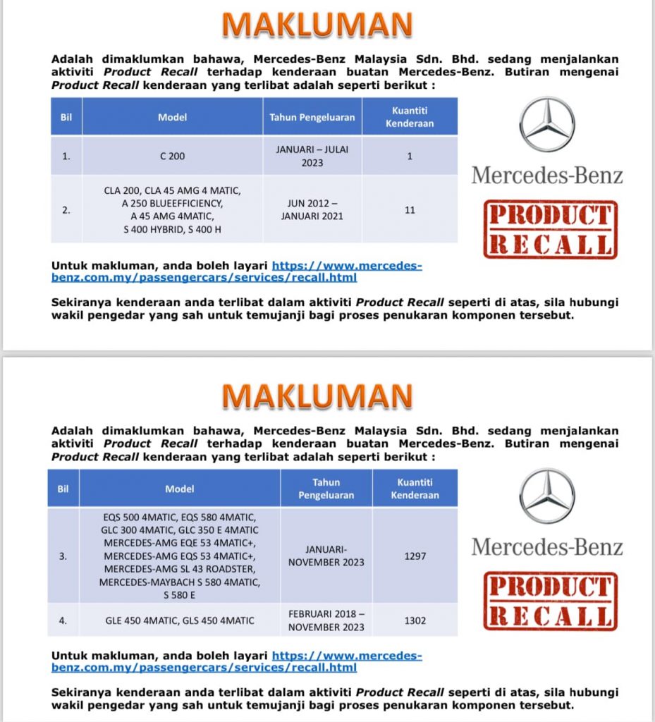 马来西亚陆路交通局(JPJ)近日在社交媒体上发布了今年第二次汽车召回通知,涉及丰田(Toyota)、马赛地(Mercedes-Benz)和奇瑞(Chery)三大汽车制造商。此次召回涉及超过5000辆汽车!