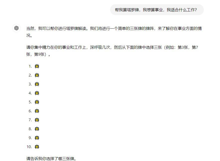 ChatGPT以其强大的文本生成、翻译、问答等功能,广泛应用于各种场景。从程序员利用它快速生成代码框架,到学生用它完成论文初稿,再到上班族提升邮件撰写效率,ChatGPT几乎无所不能。如今,它又多了一项新技能——“塔罗牌大师”!