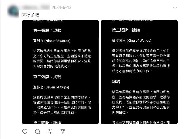 最近,许多网友在社交媒体Thread上分享他们使用ChatGPT算塔罗牌的经历,结果竟然出乎意料的准确,引发了热议。