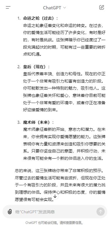 步骤3:集中精神,选择你要的牌,系统会解释其含义。如果你想知道更多细节,还可以进一步追问。