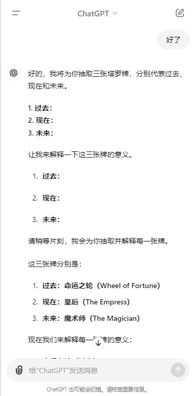 步骤1:打开ChatGPT,在对话框内输入“我要算塔罗牌”,然后针对你想问的问题进行描述。