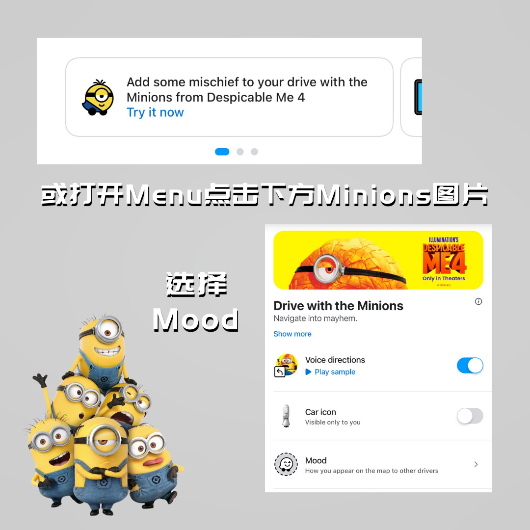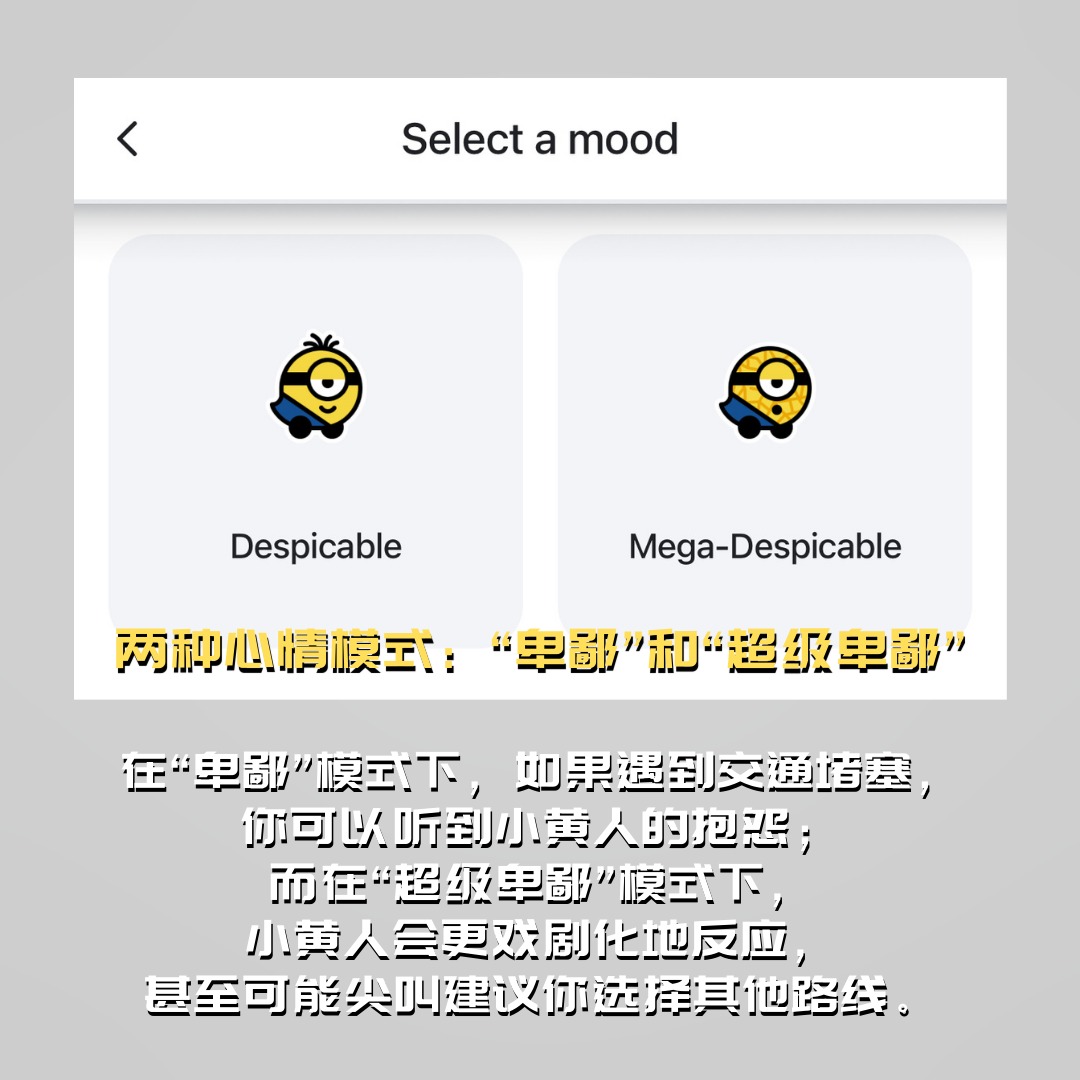 Waze推出Minions配音导航,萌趣十足陪你出行! 2 Jul , 2024 | 吃喝玩乐 Waze推出全新Minions配音导航!现在可以让小黄人帮你导航,简直太可爱啦! 这次推出是为了与《卑鄙的我4》电影上映同步,Waze提供了两种心情模式选择:“卑鄙”和“超级卑鄙”。 在“卑鄙”模式下,如果遇到交通堵塞,你可以听到小黄人的抱怨;而在“超级卑鄙”模式下,小黄人会更戏剧化地反应,甚至可能尖叫建议你选择其他路线,超级可爱! 分享