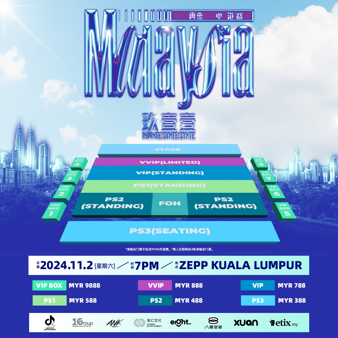 演唱会门票价格为RM888 (VVIP), RM9888 (VIP BOX) , RM788 (VIP) , RM588 (PS1) , RM488 (PS2) , RM388 (PS3)。 开票日将在7月20日,中午12点,在官方网站etix.my 开卖。其中VVIP门票享有彩排、1:1合照、签名海报等福利外,还有机会赢取玖壹壹签名拍立得。
