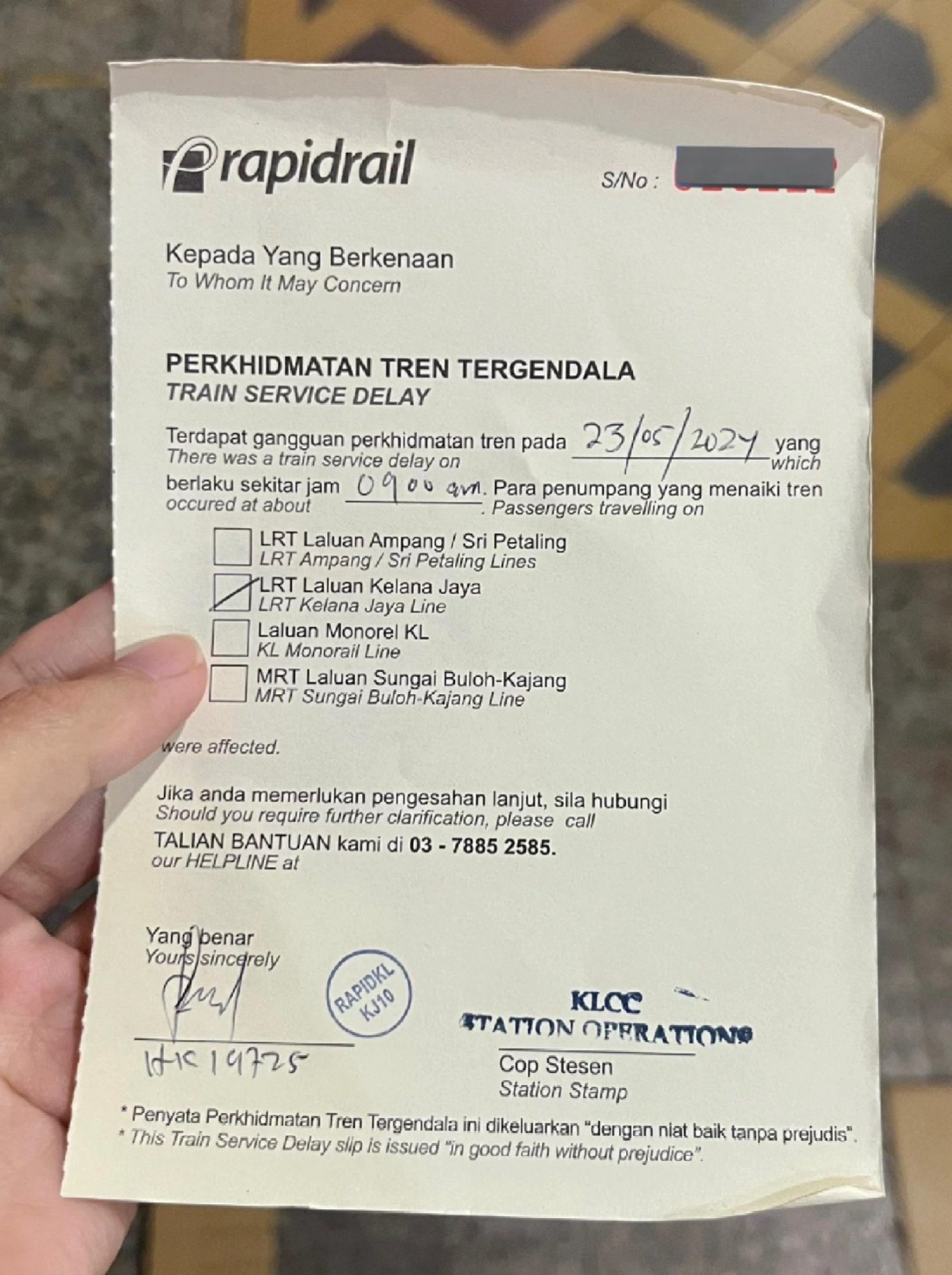 社交媒体上的一位用户艾达分享了这个有用的提示。5月23日,她因格拉那再也线(LRT Laluan Kelana Jaya)的延误而迟到上班。她发现,吉隆坡快捷通公司会根据乘客的要求提供列车延误证明。