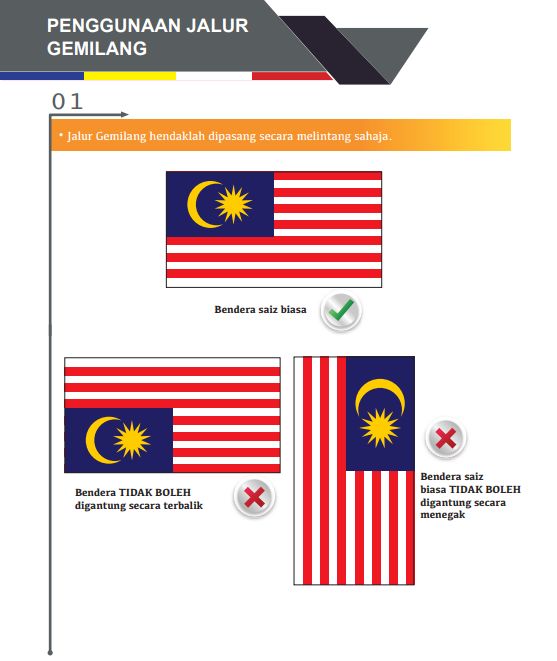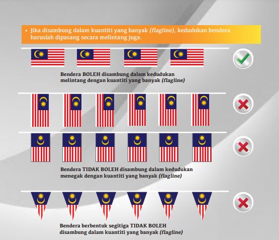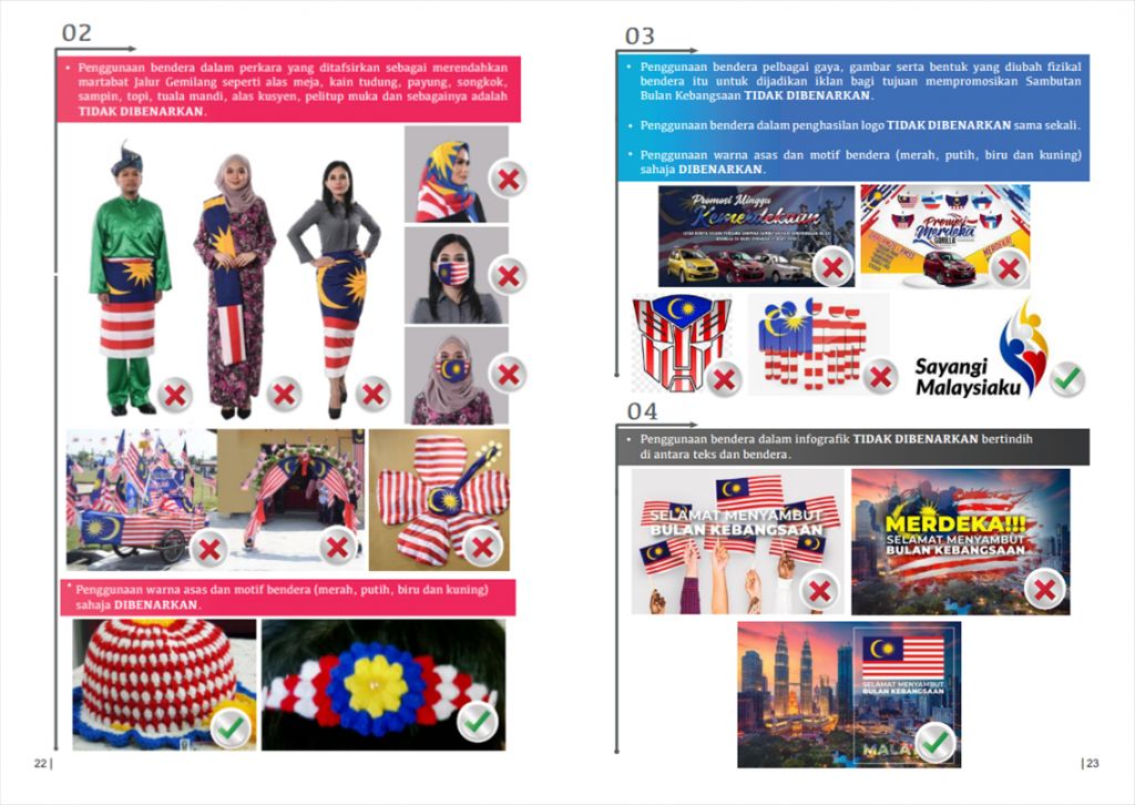 大马新闻局还提醒,不得将Jalur Gemilang用作桌布、头巾、雨伞、浴巾、帽子、口罩、窗帘、服饰等。改变国旗设计、使用国旗作为标志或在照片中与文字重叠等行为同样被禁止。只有使用国旗的颜色(红、白、蓝、黄)作为设计元素是允许的。