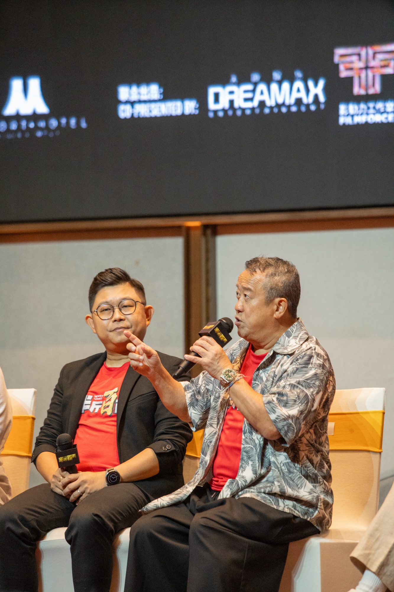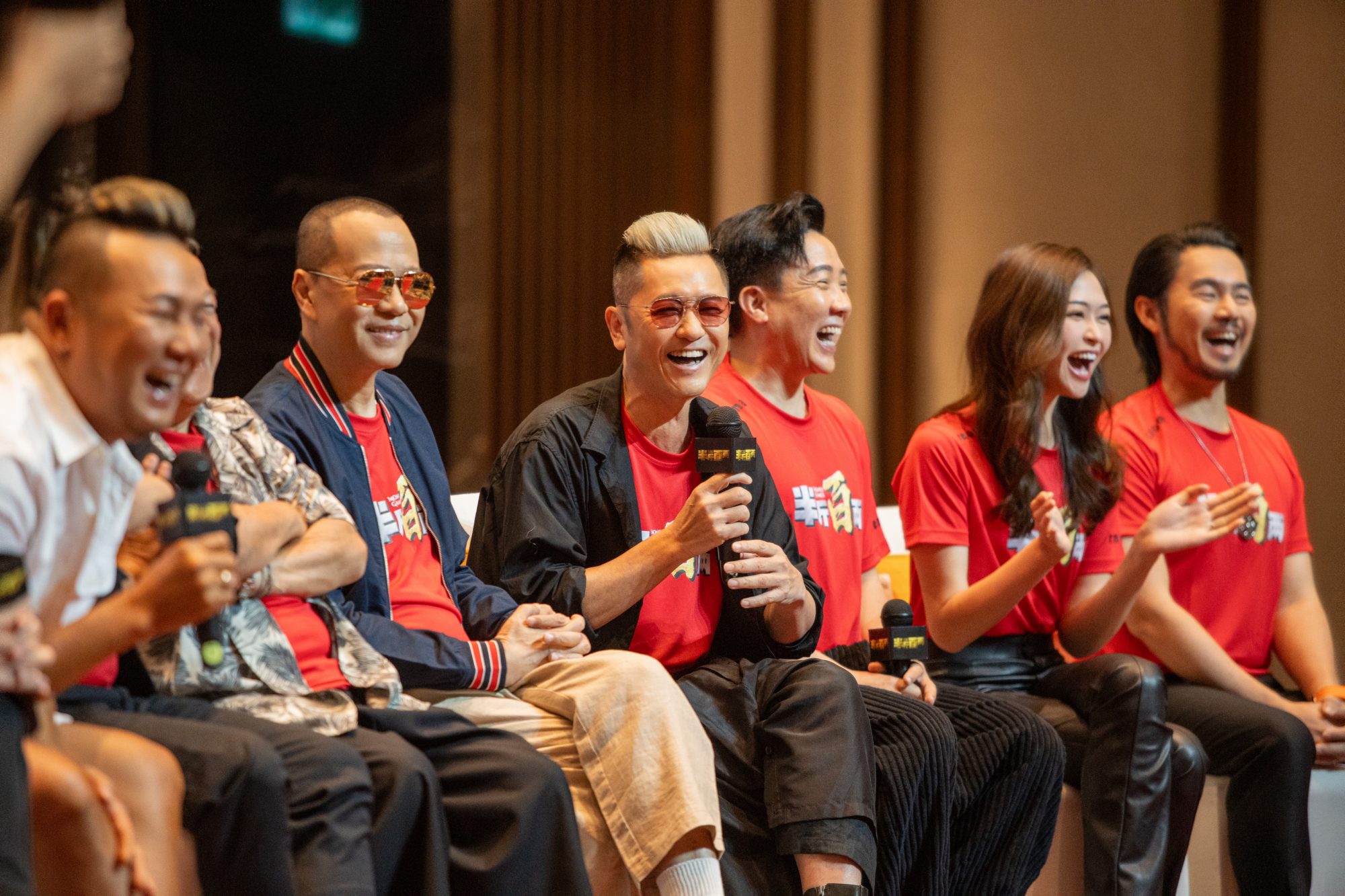 记者会当天,他们的红色戏服后面有许冠杰的超经典歌曲《半斤八两》歌词,被问是不是会改编成为这部电影主题曲?林德荣神秘说:“大家持目以待,会有惊喜!”
