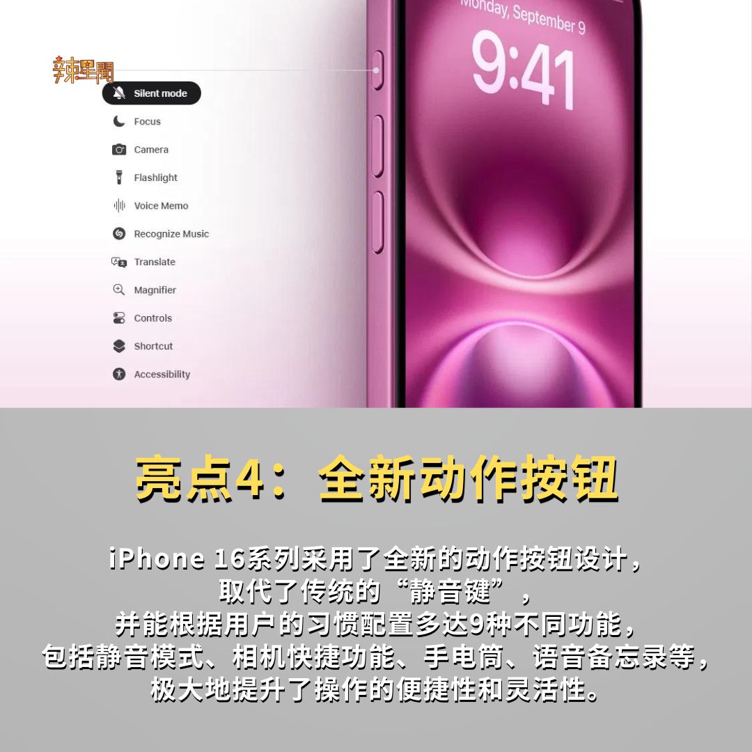 iPhone 16系列重磅来袭 盘点这五大亮点 10 Sep , 2024 | 吃喝玩乐 苹果粉们,iPhone 16系列终于发布,无论是硬件升级还是价格都让人期待已久,一起看看这次最新款的特别之处! 分享