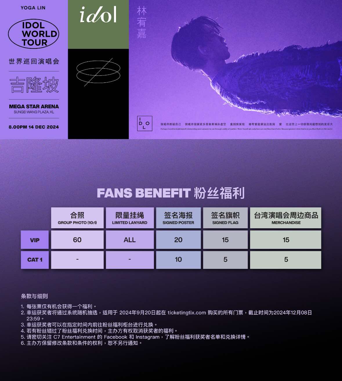 吉隆坡站购买VIP以及CAT 1门票的歌迷,更有机会参与幸运抽奖,以享有粉丝福利,当中包括合照、签名海报、签名小旗帜、演唱会周边商品等。