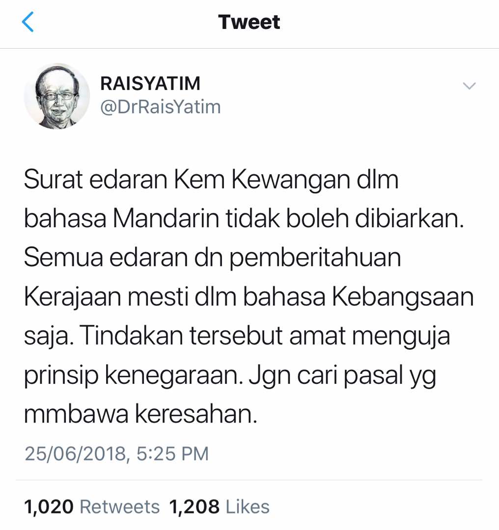 政府官方文告必须是国文! 26 Jun , 2018 | 民生关注 前新闻通讯与文化部长莱雅丁“发声”,他昨日在推特上指出,财政部发出所有政府的官方文告都必须是国文。 他说,这是国家的原则,不要再大费周章,引起各造焦虑。 该推文昨天中午5时25分发出,至今已1020 转推,获得1208个赞。 分享