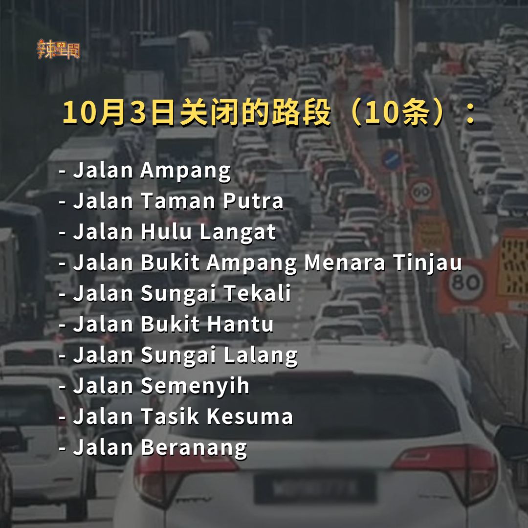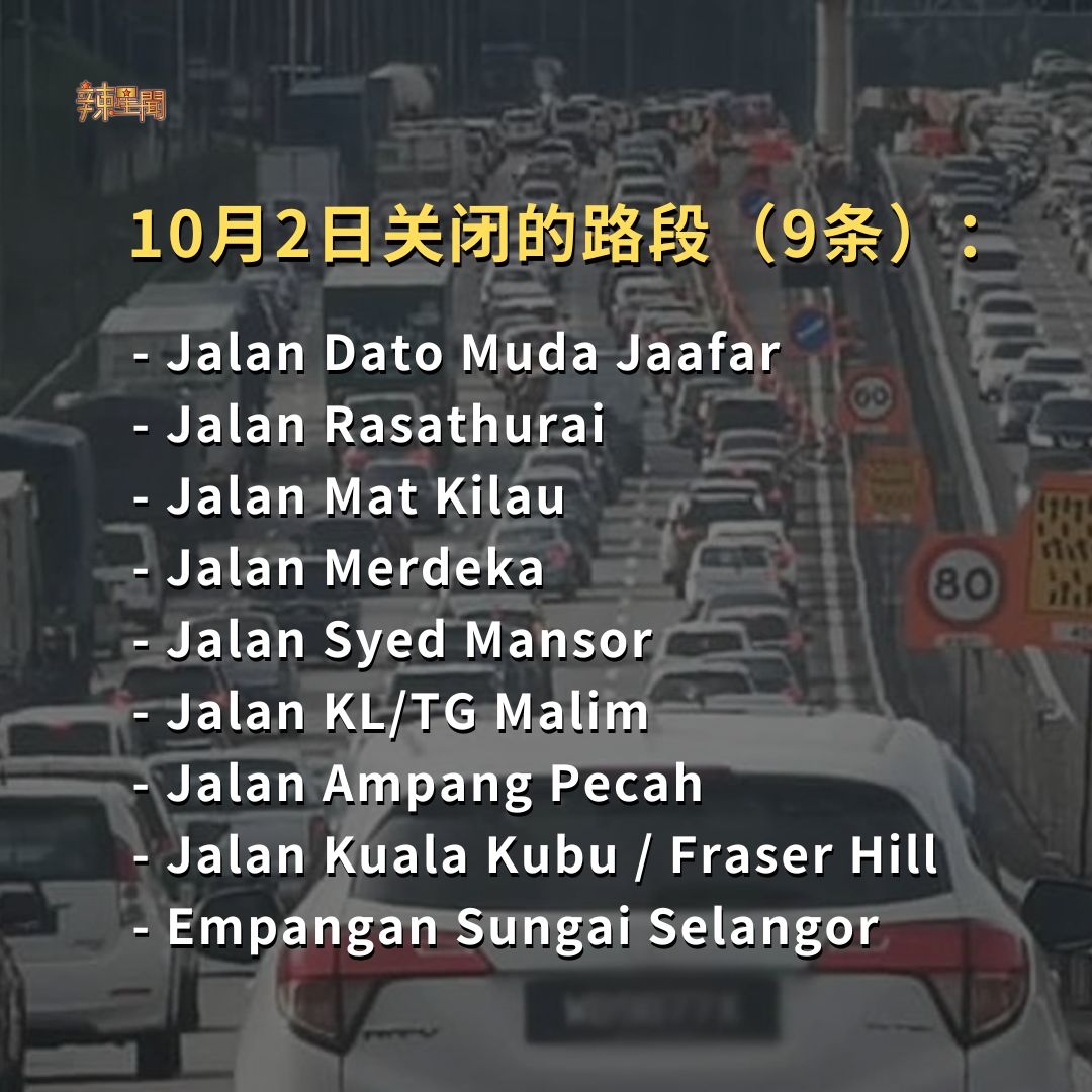 环浮罗交怡脚车赛来袭!10月2日3日雪州19条路段封闭 1 Oct , 2024 | 吃喝玩乐 为了配合2024年环浮罗交怡脚车赛(Petronas Le Tour De Langkawi),雪兰莪将在9月29日至10月6日期间,关闭19条道路。 驾驶人士请注意,封闭的路段包括乌鲁雪兰莪、安邦和加影等地,涉及总长达90.4公里。具体封路时间为10月2日和10月3日,以确保比赛顺利进行。 在此期间,使用上述路段的居民和驾驶人士应提前规划行程,避开受影响的道路,听从现场交警的指示或选择替代道路通行。 分享