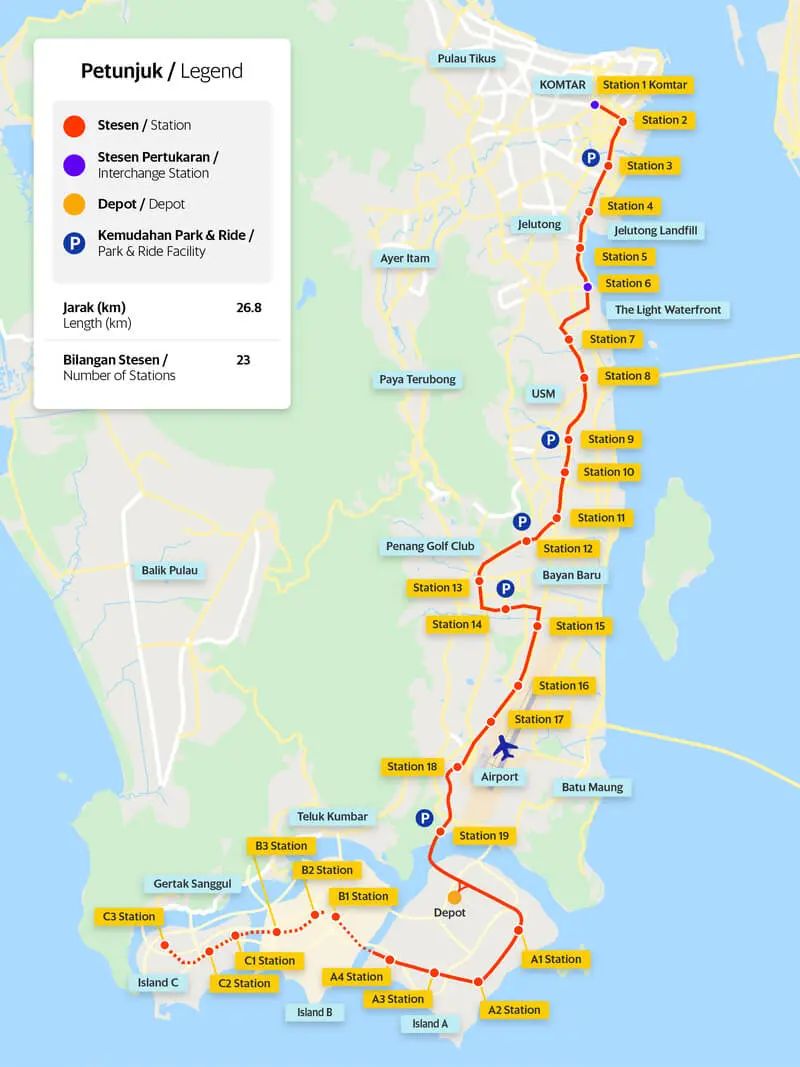 这项数十亿令吉的项目将从北海的槟城中环广场开始,跨越槟威海峡至五条路,途经光大、斯里槟榔、双溪槟榔、东日落洞、The Light、牛汝莪、理大的大学路、双溪赖、双溪里蒙、武吉占姆、槟州国际会展中心、登雅路、自由工业区、南部自由工业区、峇六拜过山、槟城国际机场、峇东和矽谷岛,总长29公里。