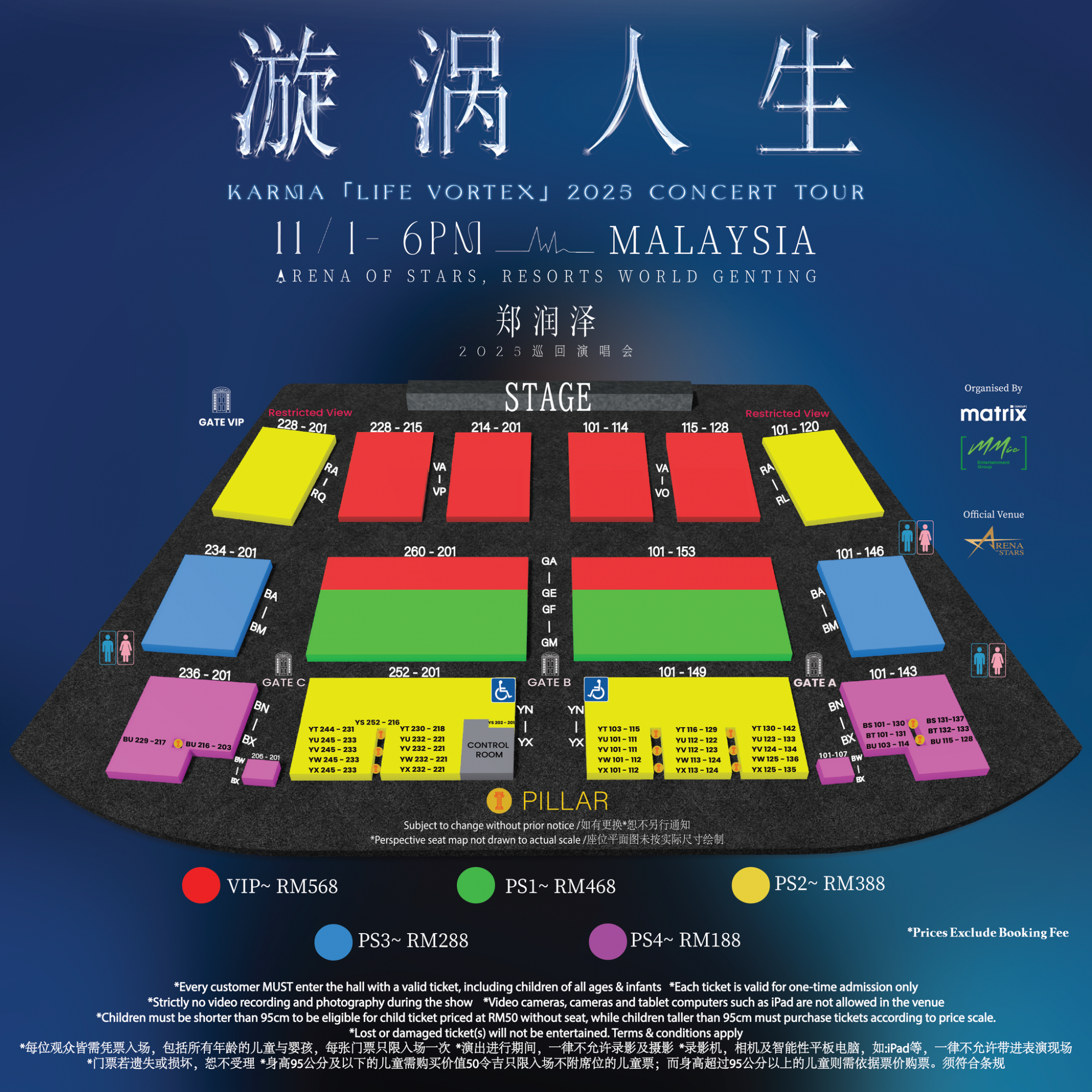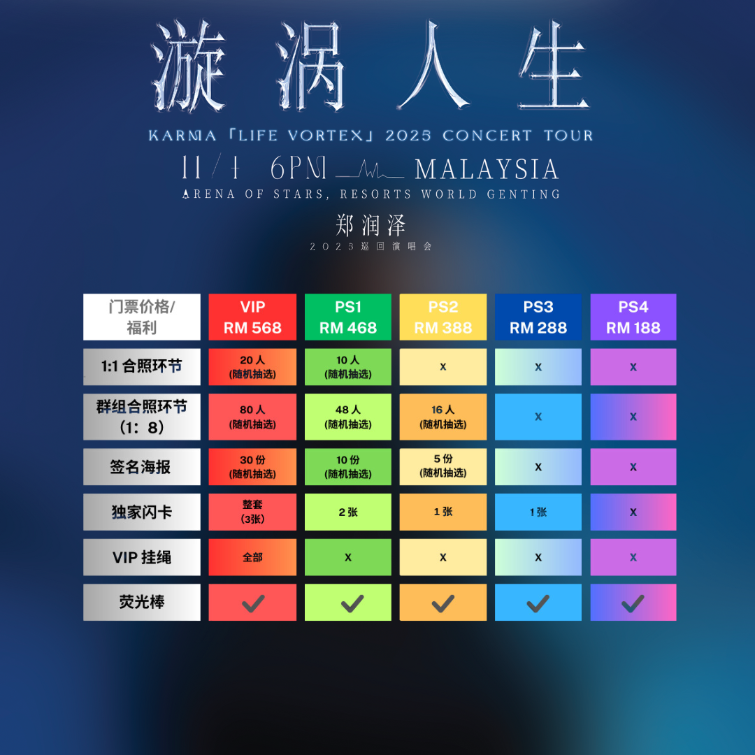 2025郑润泽《漩涡人生》巡回演唱会马来西亚站将于2025年1月11日(星期六),傍晚6时于云顶世界云星剧场感动登场。演唱会票价分别为:568令吉(VIP)、468令吉(PS1)、388令吉(PS2)、288令吉(PS3)及188令吉(PS4), 所有票价不含手续费,门票附带粉丝福利。