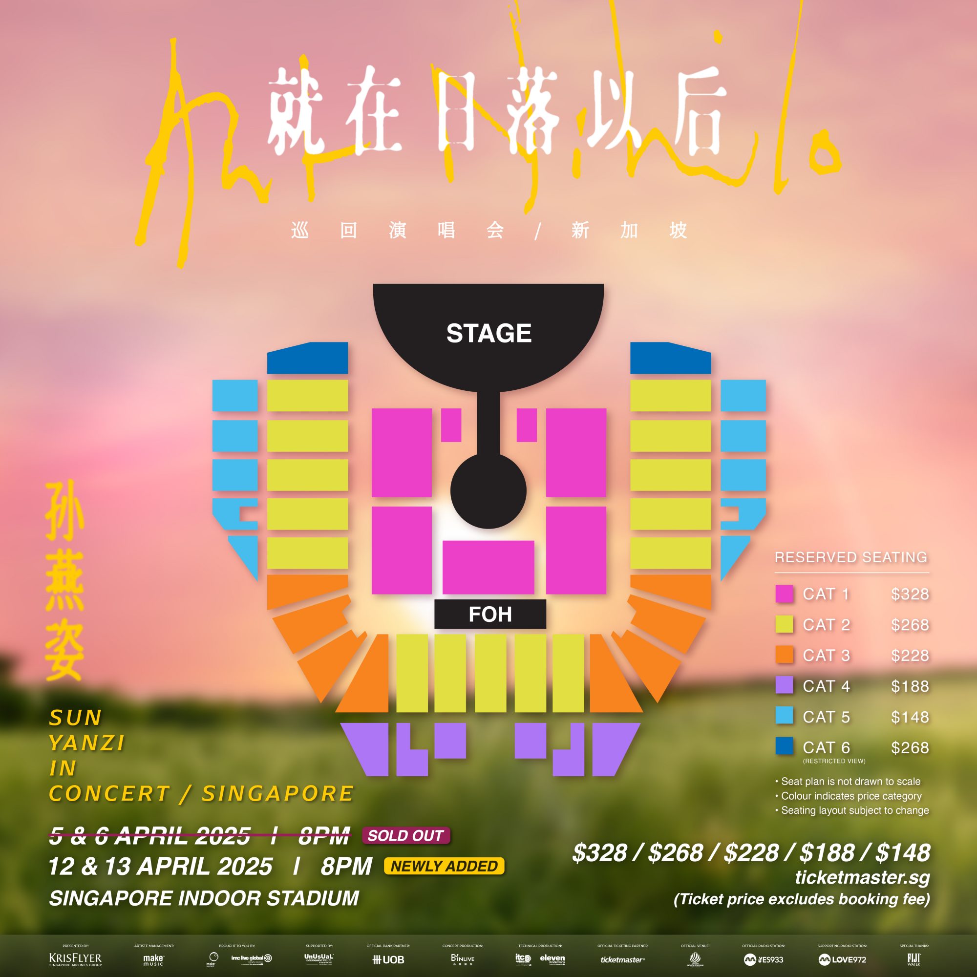 2025年4月5日和6日在新加坡室内体育馆揭开序幕的孙燕姿《就在日落以后》巡回演唱会的门票火速售罄!由于粉丝们热情敲碗加场,主办方响应广大粉丝的号召,在多方协调后,终于确认并宣布直接加开两场,2025年4月12日和13日,约定歌迷在新加坡室内体育馆极美欢庆。
