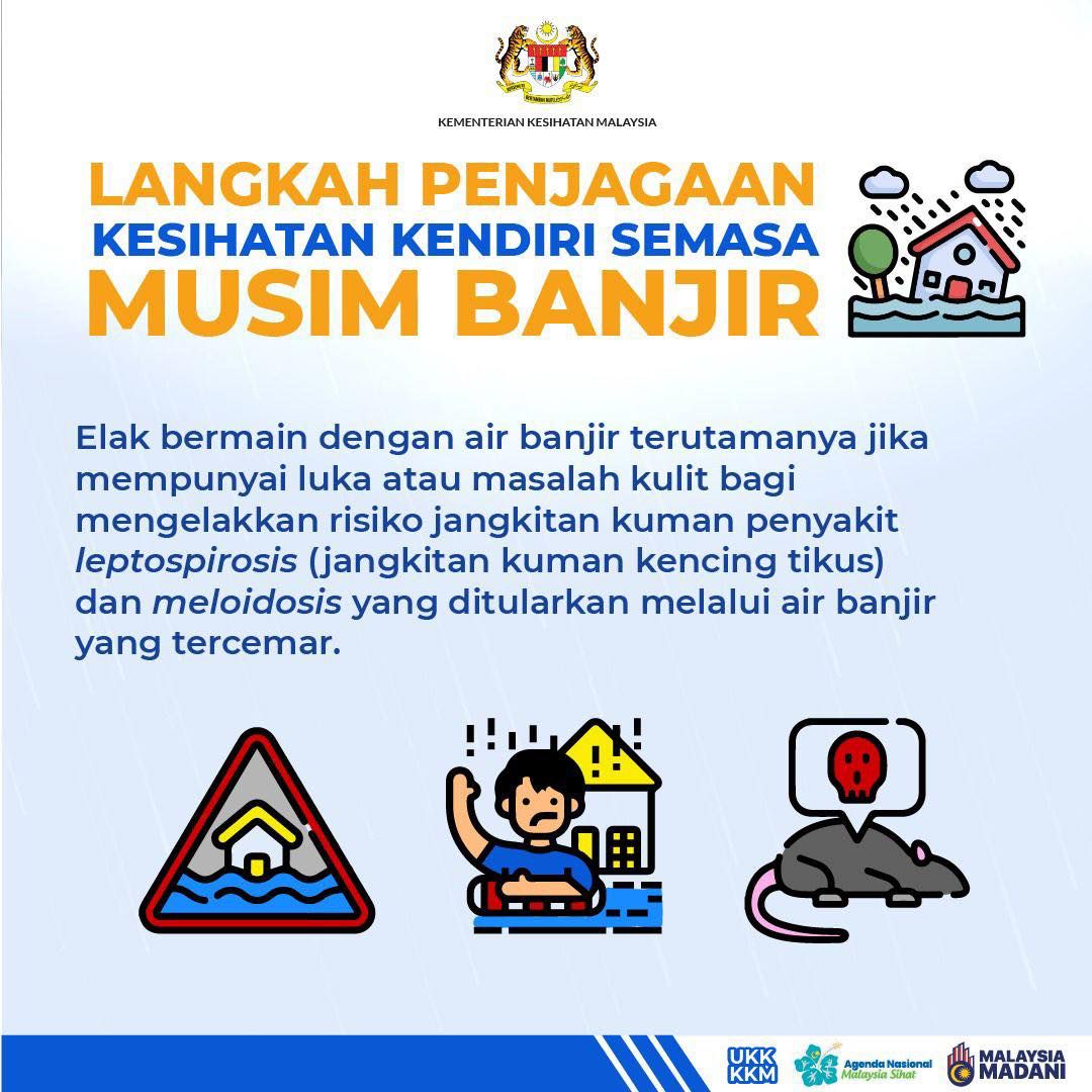 卫生部通过社交媒体发布公告提醒,水灾期间的积水和被污染的河水存在潜在的健康威胁,尤其对喜欢戏水或涉水的人来说,可能因直接接触受到感染。
