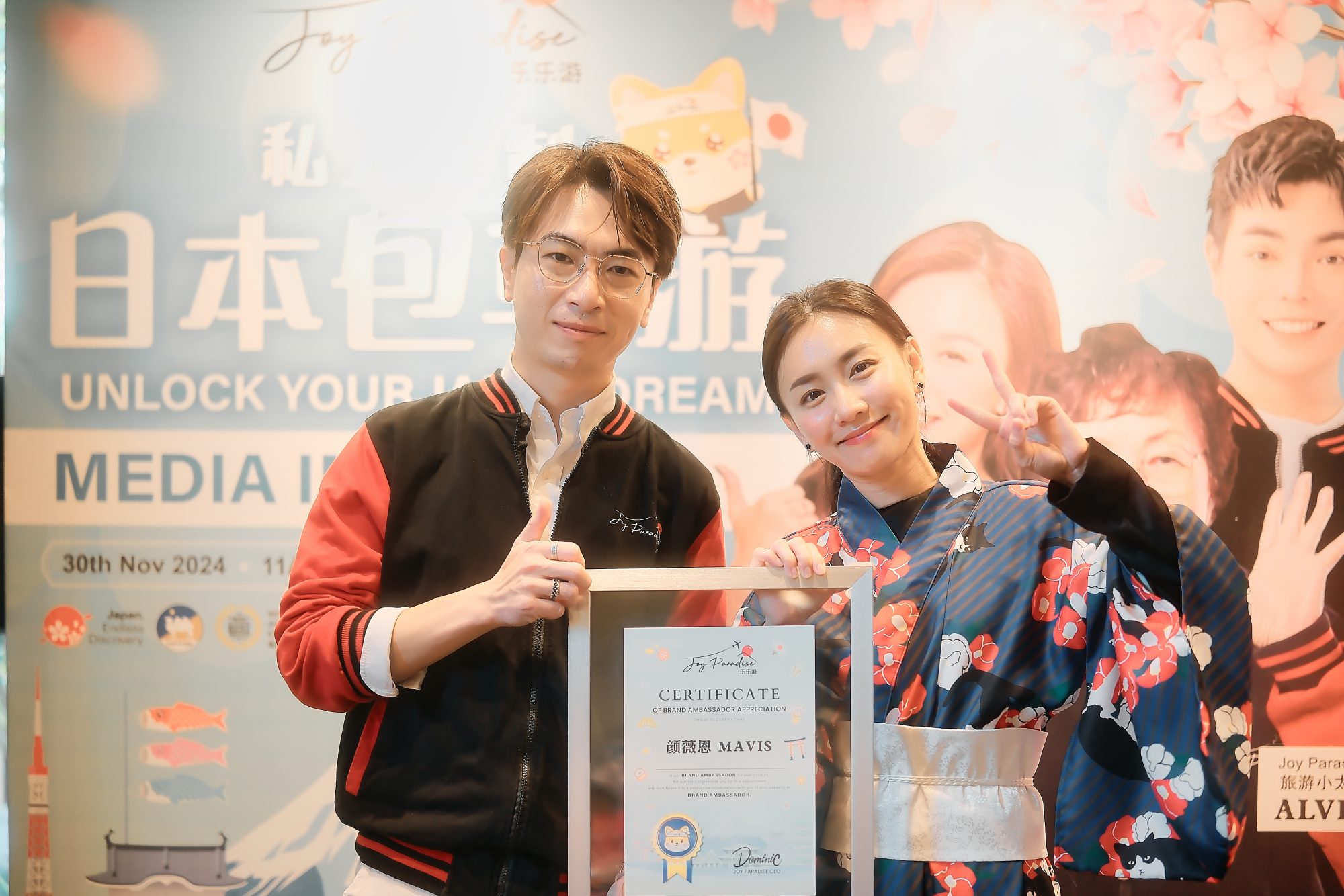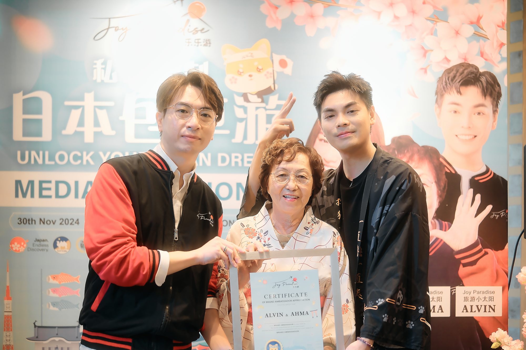 Joy Paradise乐乐游同时公布三人的代言称号,分别是颜薇恩是“旅游小天使”、Alvin是“旅游小太阳”而Ah Ma就是“旅游大太阳”,三人充满温暖与正能量,是旅行出游最佳的代言人选。该公司首席执行官Dominic Teh也在现场颁发认证给予三位代言人,表示他们将为品牌注入更多活力及创意。
