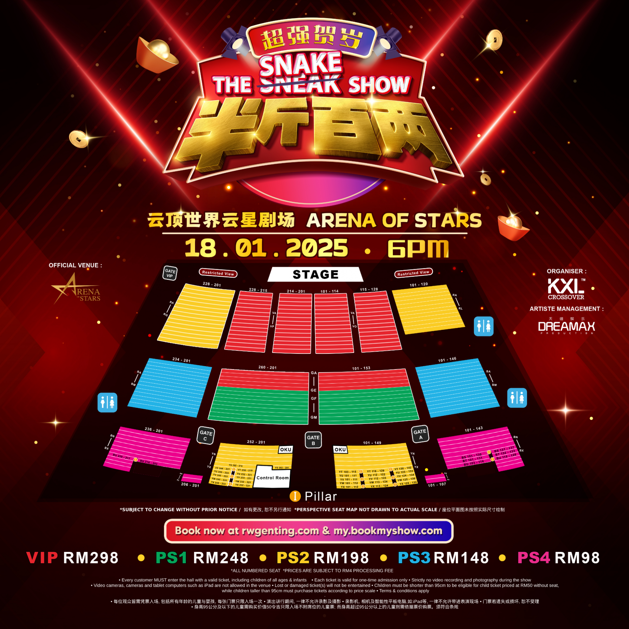 《半斤百两 超强贺岁 The Snake Show》定于 2025 年 1 月 18 日 (星期六),傍晚 6时在云顶世界云星剧场喜气洋洋举行。票价分为 298令吉(VIP)、248令 吉(PS1)、198 令吉(PS2)、148 令吉(PS3)及 RM98 令吉(PS4),所有门票不包含 4 令 吉手续费。