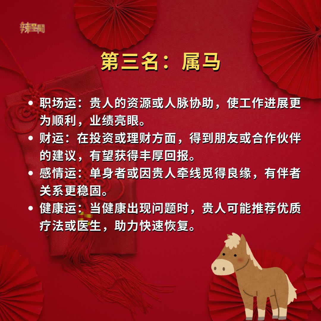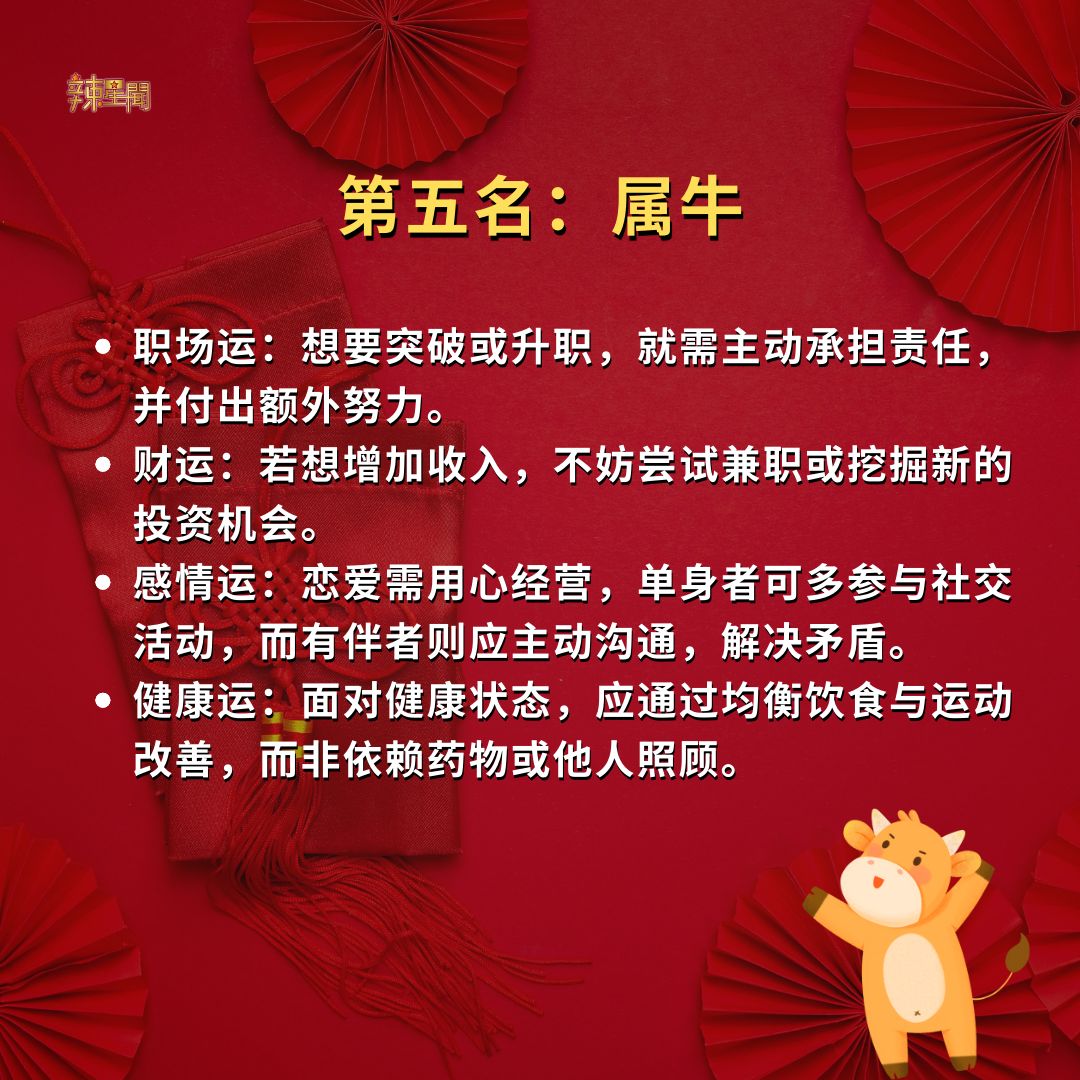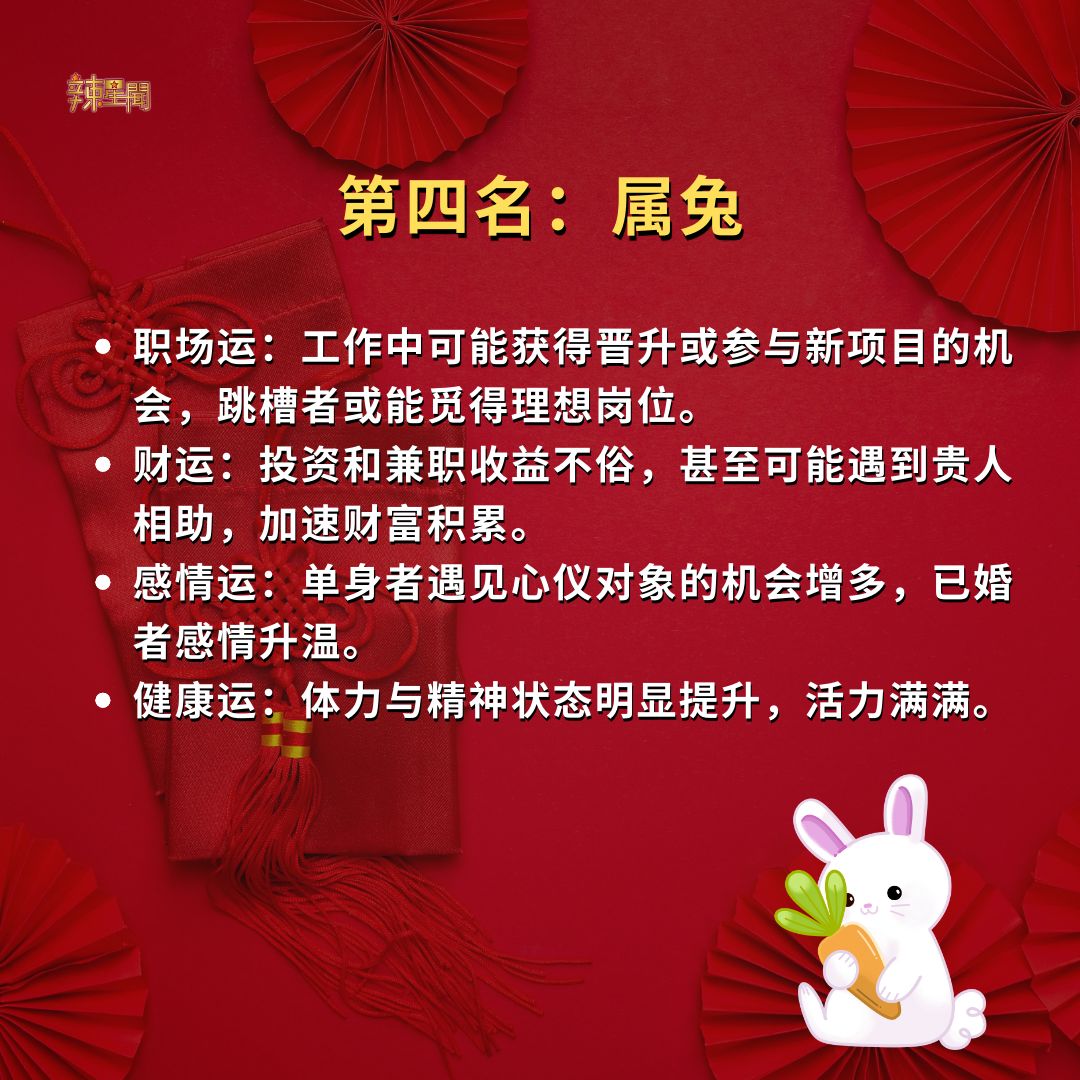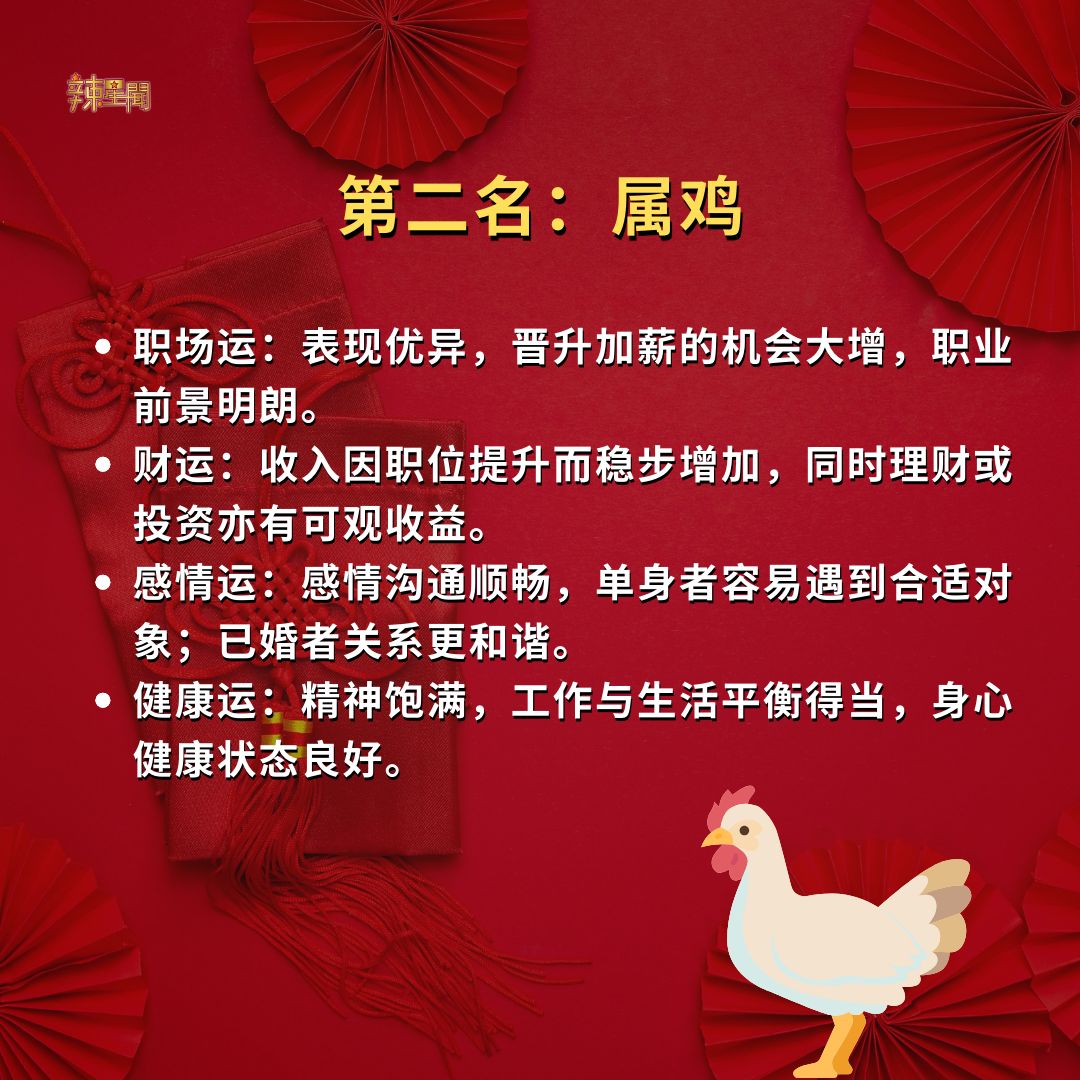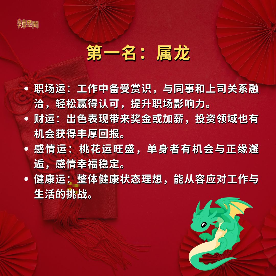 快看看你是否榜上有名!2025年好运生肖TOP 5! 11 Dec , 2024 | 吃喝玩乐 时间飞逝,转眼间2024年只剩一个月,2025年即将到来!无论这一年你过得如何,都已成为过去。新的一年蕴藏着无数可能,让人满怀期待。以下为命理专家预测的2025年好运生肖TOP 5,赶紧看看有没有你的份吧! 2025年的好运就在前方,无论上榜与否,都期待你抓住机会,用努力迎接更美好的未来! 分享