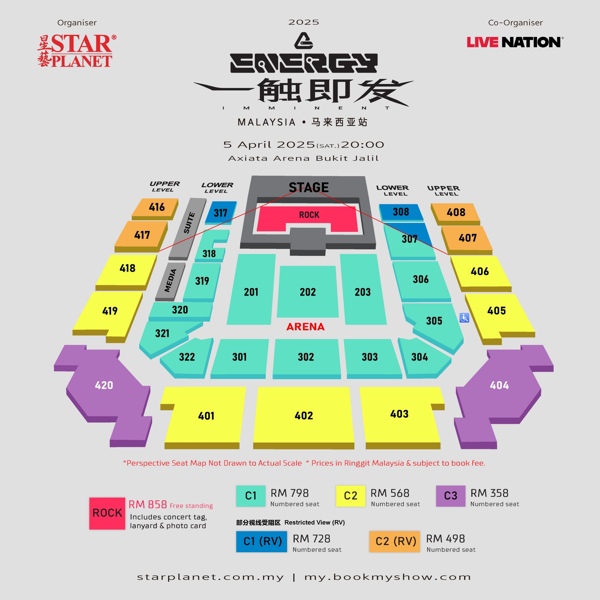 由Star Planet 星艺娱乐主办,Live Nation 协办,Energy《一触即发》巡回演唱会-马来西亚站的门票将于2025年1月21日,中午12点通过my.bookmyshow.com正式公开发售,票价为ROCK-RM858、C1-RM798、C2- RM568、C3-RM358、C1(Restricted View) RM728以及C2(Restricted View)RM498。