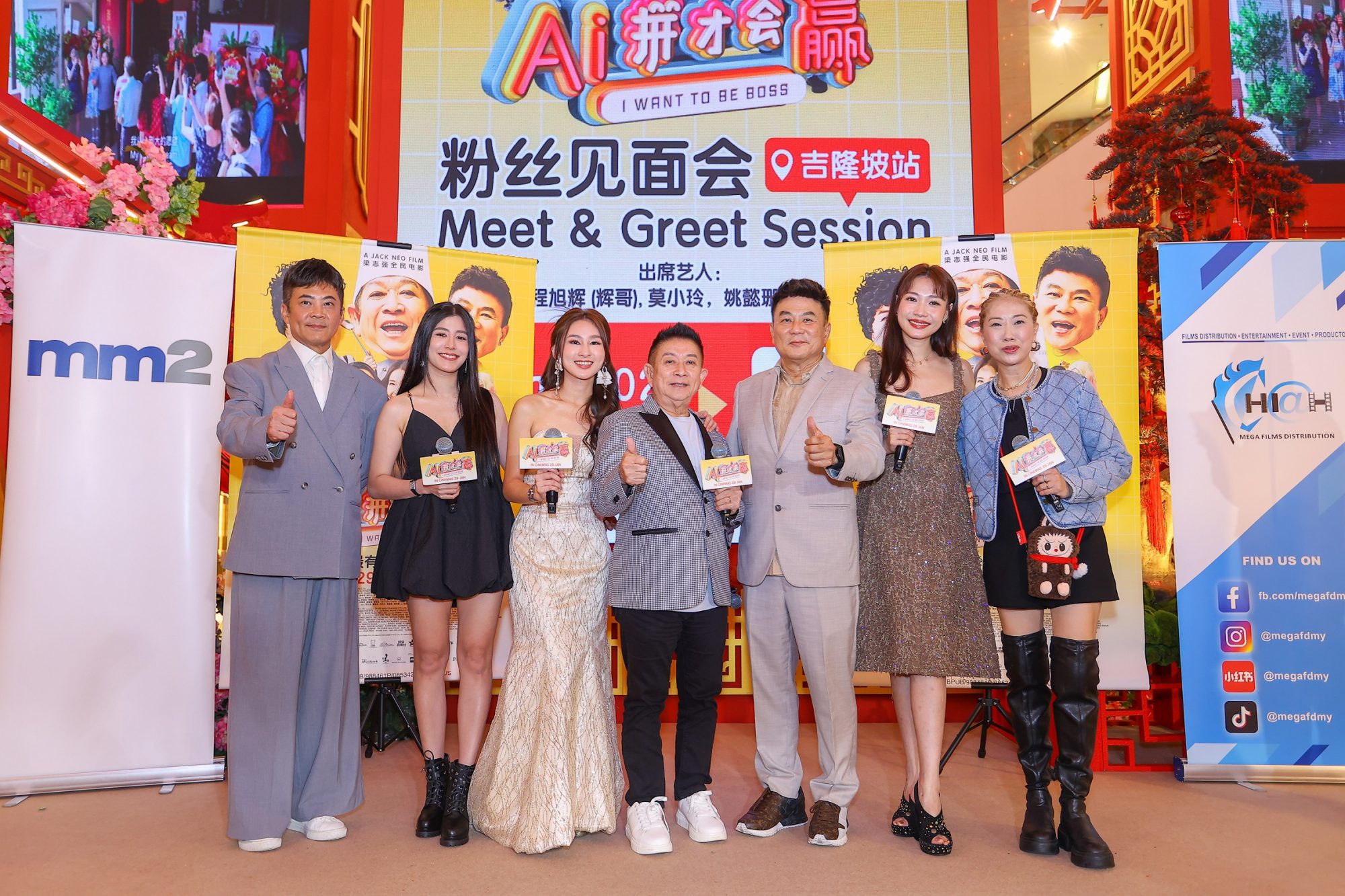 梁导梁志强日前和一众演员在记者发布会后,马不停蹄为《AI拼才会赢》开展路演活动,他们率先在吉隆坡柏威年广场大厅与现场粉丝会面,在戏中饰演“舌尖女王”姚懿珊助理的大马网红Inthira 也盛装亮相。辉哥在这次独挑大梁演男主,主持人问他NG了多少次,辉哥佯装生气喊:“我是男主角,好好不行吗? 你偏爱问这种问题! 这是我的最后一部戏!”